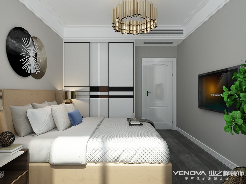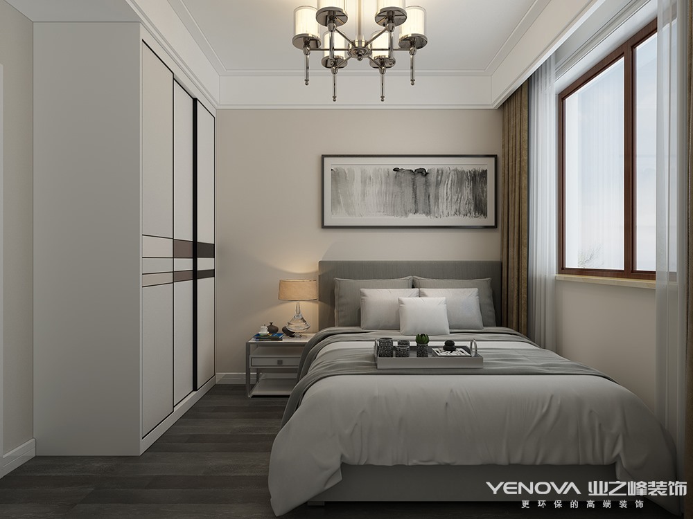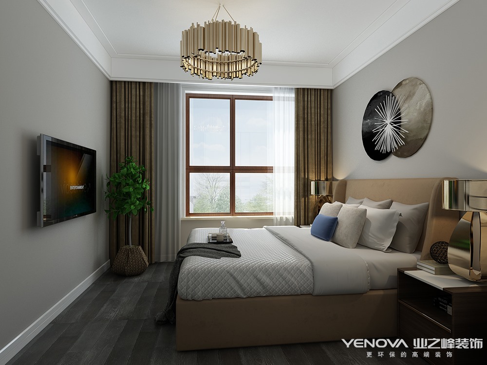 卧室运用素雅的色调,棕色床配浅咖色空间,藕色的床品,让整个空间沉稳却不失活跃。