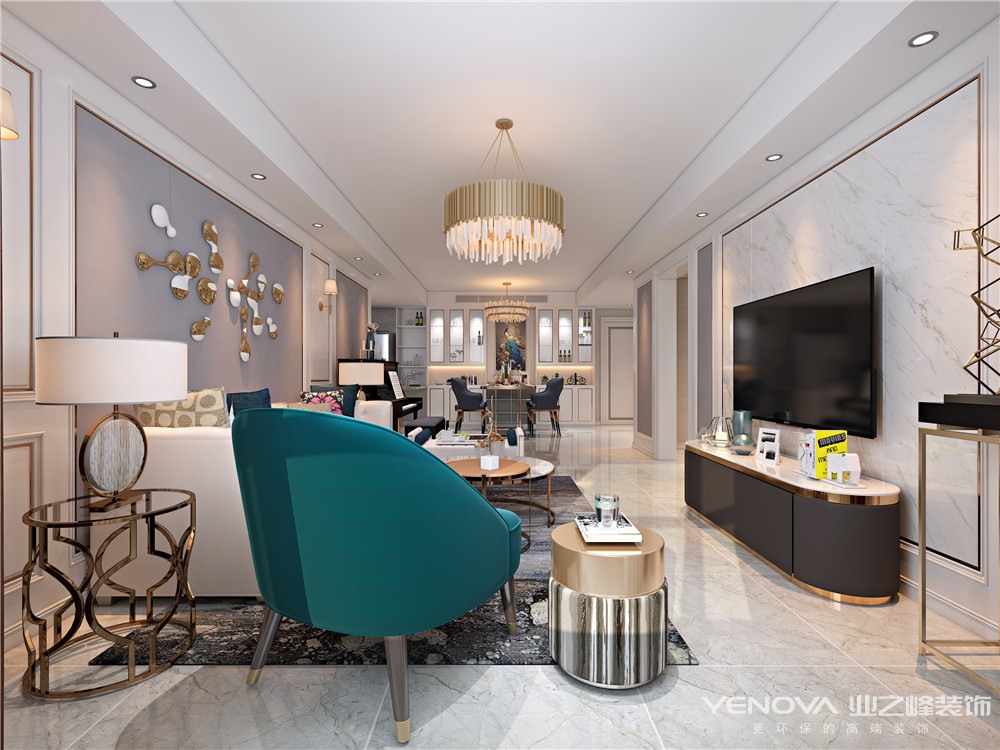 空间以白灰为主色调开启了“摩登”艺术之旅,客厅重点突显家具品质在空间中的重要性,跳出眼帘 翠绿真皮沙发是整个空间不安份的元素,造型舒展,仿佛向人发出邀请,落座瞬间,又有一种被温暖环抱,空间疏密有致,调节空间节奏感,进而使环境和谐有序。