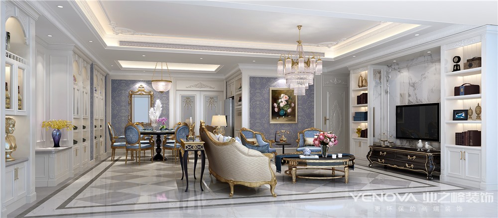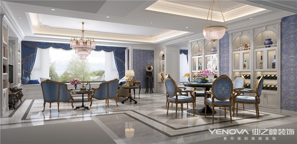 成都业之峰装饰设计案例,本案为法式风格,家庭常住人员两名,采用蓝色色调为主题色调,在不失时尚感的条件下保持了家的温暖。摒弃了传统的金色系而选择了蓝色作为主体色调,充分表达出客户优雅的生活品味。