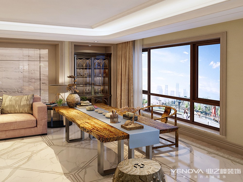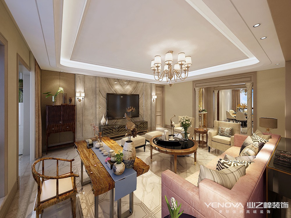 将美式作为此空间的设计风格,设计上讲求心灵的自然回归感,给人一种扑面而来的浓郁气息,以功能性和实用舒适为考虑的重点。此空间的采光很好,而且南北通透,因此家具上采用深色木布结合,沉稳温暖;在客厅与餐厅背景墙的设计上,使用石材和软包、镜面等材料,软硬材质的交错使用,使空间干净宽敞而富有历史气息。