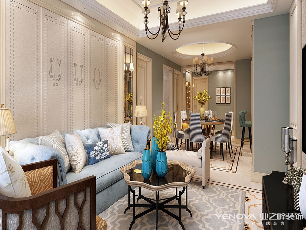 色彩上主要采用温润的驼色与清爽的色系搭配,使空间似清新幽然的栀子花,淡雅脱俗。结构上遵从现代简约美式的基调,整个空间雅而不奢,简而不凡。整体的空间对色彩的运用给人温和柔美的感觉,美式简约风格所具有的贵气感、自在感与情调感。