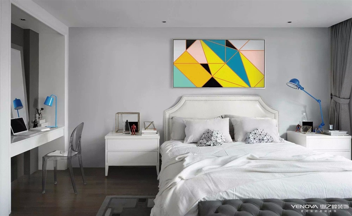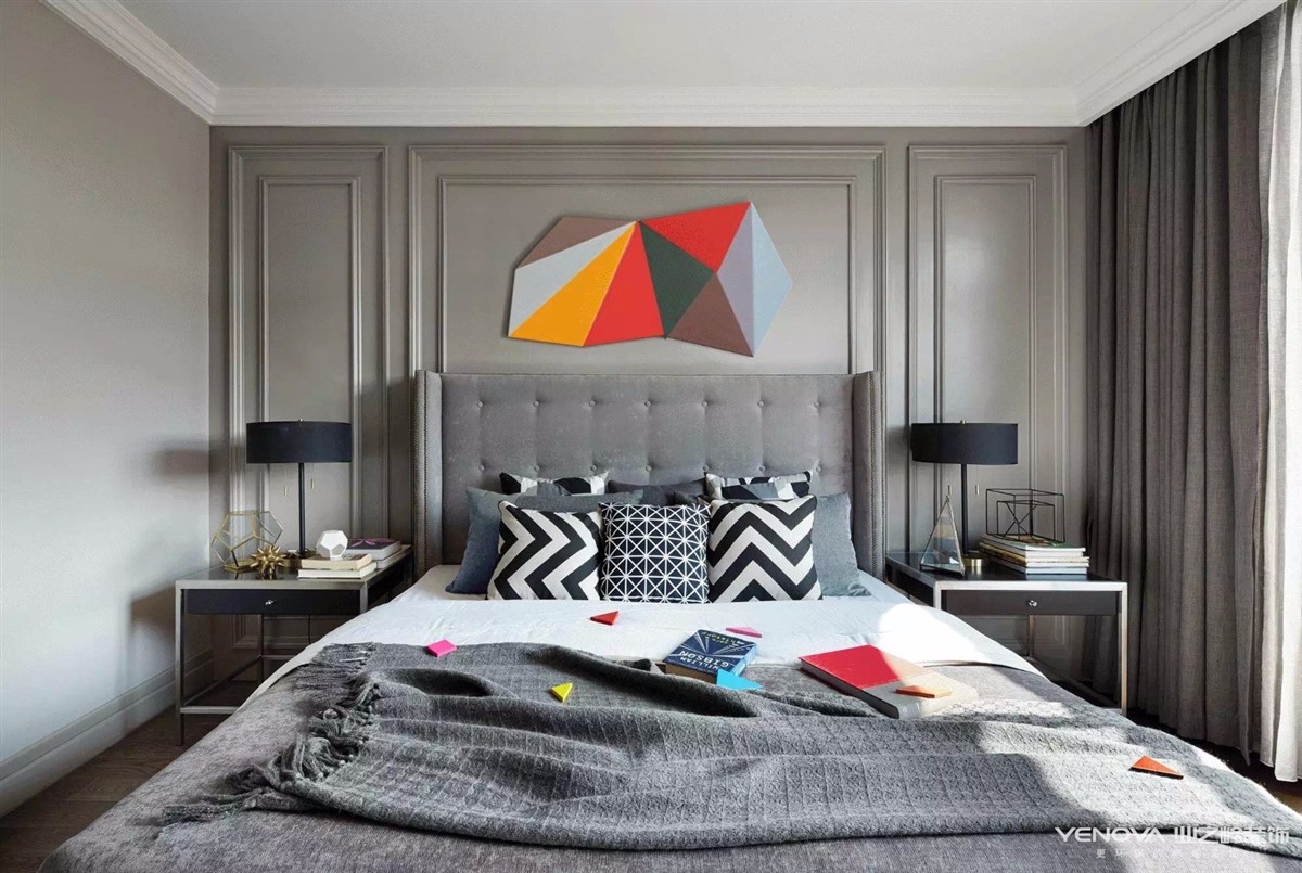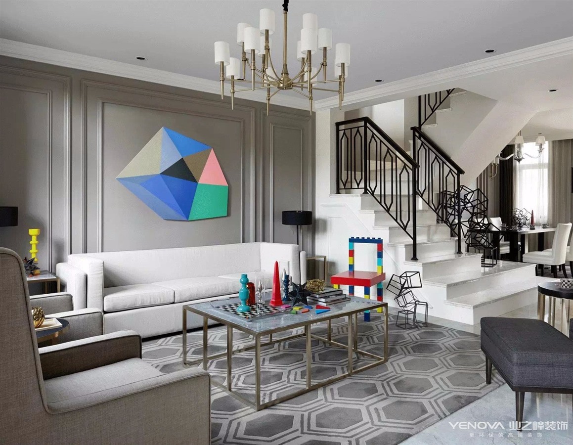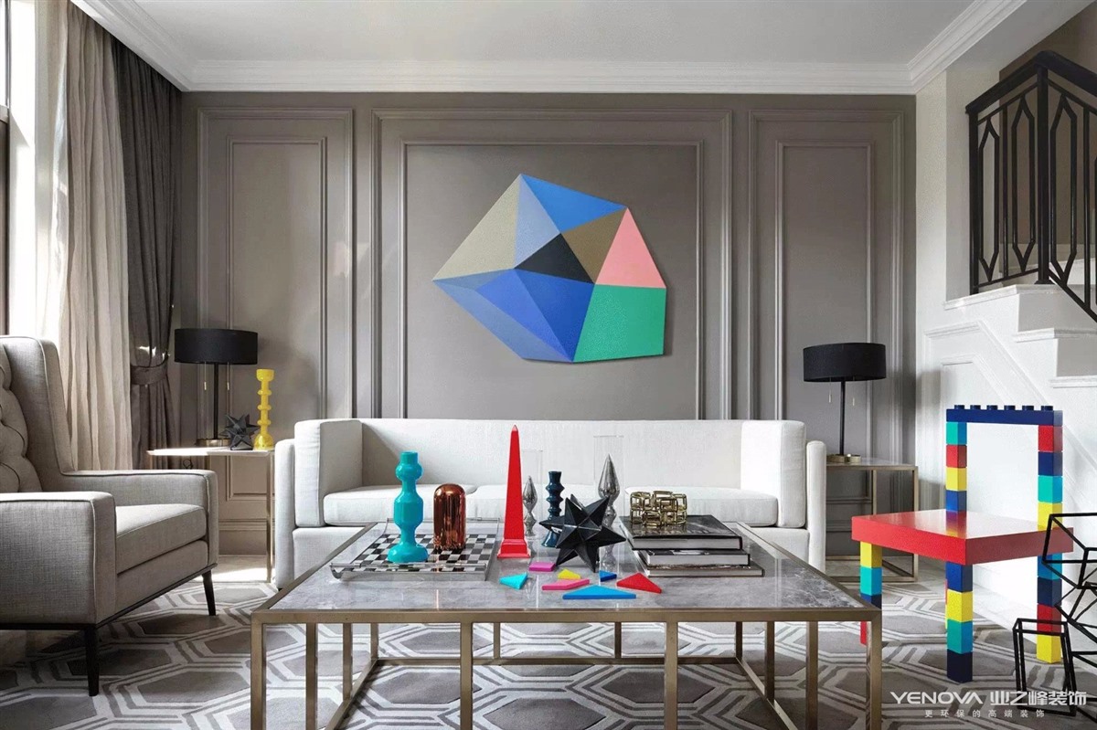 简洁时尚是我们追求的主题,所以大量采用调色乳胶漆和简洁的样条线统一空间,舒适自然。本设计特别注重简洁的软装饰品,尤其是各个空间互相统一呼应的现代几何装饰挂画