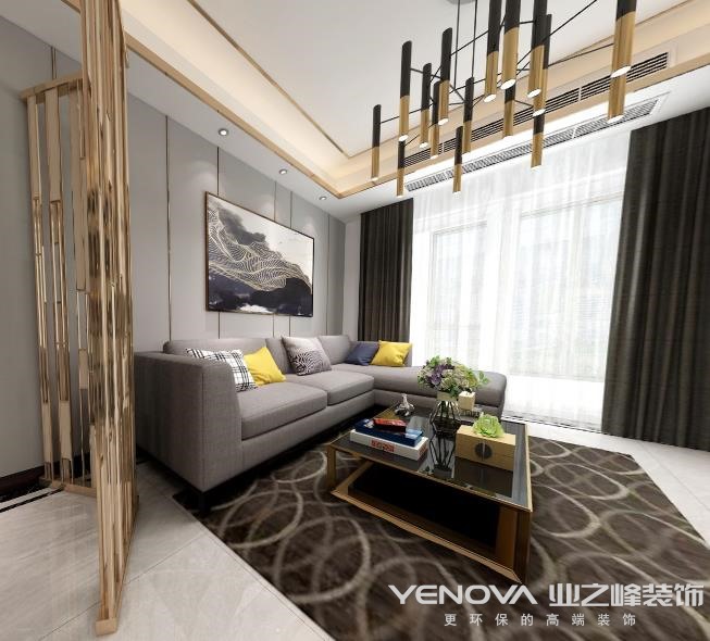 客厅通透大气,整体大面积大理石与金色线条相结合,配合古典的圆柱形灯具,增添整个空间的奢华感,现代与古典并重为设计原则,搭配素色沙发增加优雅感。舒适却无损高贵与雅致,沙发旁摆设金属屏风增强空间区域的划分,给家庭空间增加了通透感,便于大家的沟通与交流,但又保证了其私密性。