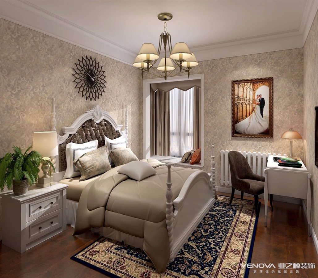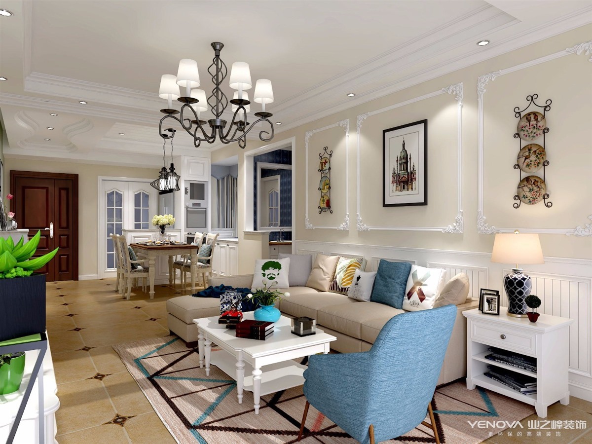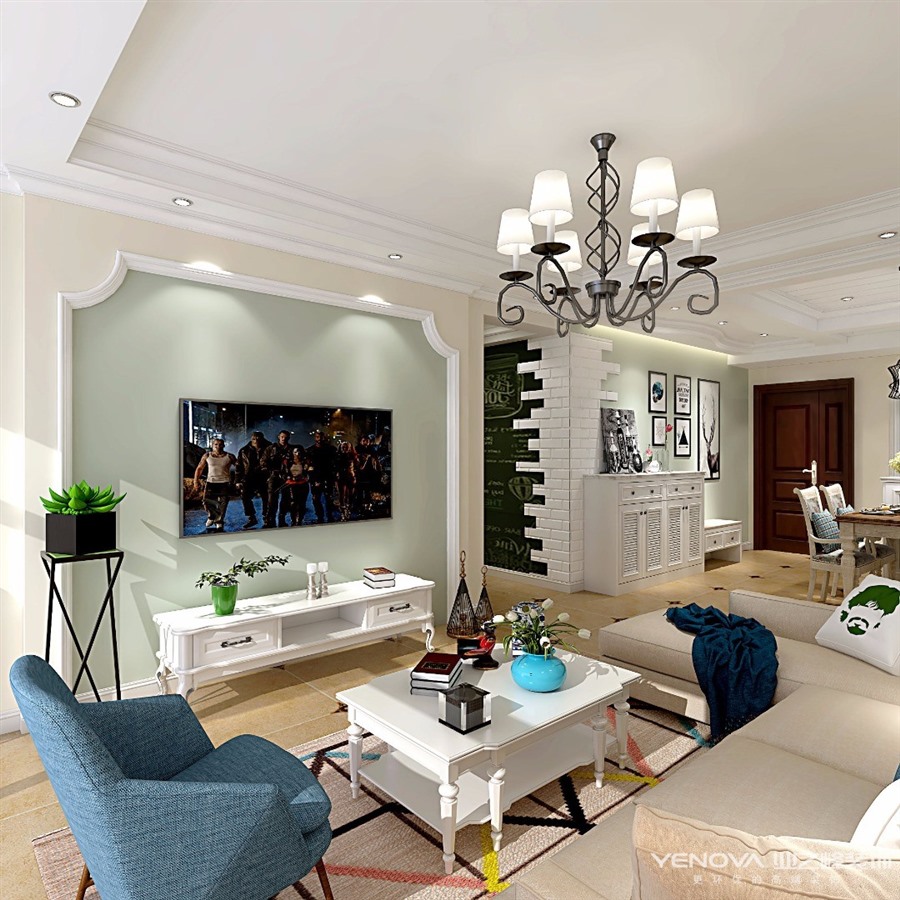 墙面采用乳胶漆调色,以蛋黄色为主色调,沙发背景墙搭配护墙板和石膏线条,整体墙面简洁灵动却不失细节;地面采用米黄色仿古砖搭配美式角花,使整个空间看起来在稳重大方的同时又多了一份跳跃的美感;电视背景大方简洁,使用跳色进行装饰,丰富色彩的同时也非常符合女主人的气质;顶面采用造型吊顶对空间进行分割与造型,单独设计了进门区间,在鞋柜墙上进行文化石装饰,由于原户型在进入主卧时留有长过道,在墙面上设计了一面黑板墙留给儿子画画使用,同时也使过道变得多姿多彩。