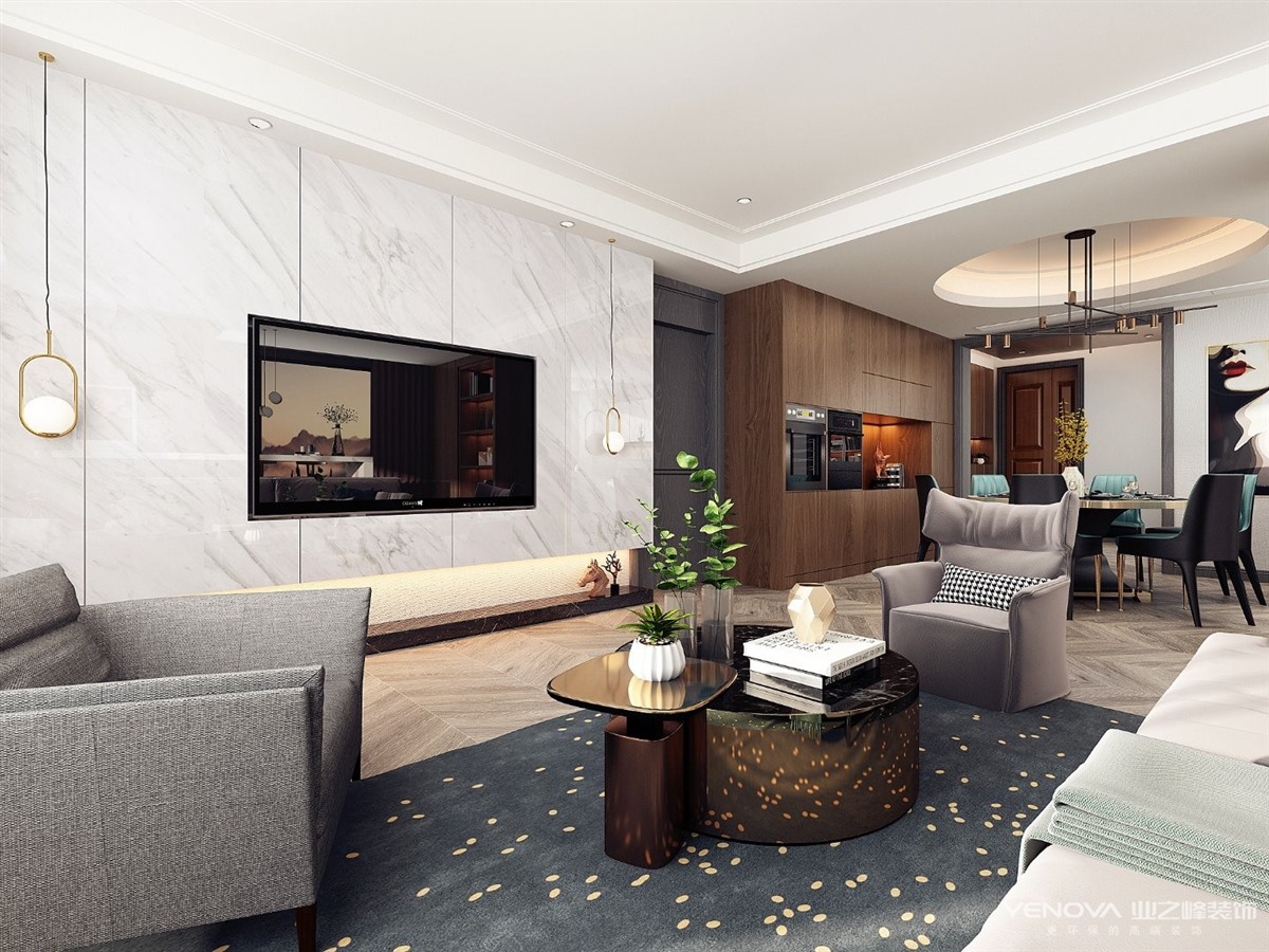 本案厨房客餐厅是连在一起,业主喜欢做饭,所以在厨房的设计上 我们在餐厅增加了一排西橱柜,蒸箱烤箱内嵌其中,开放式厨房,与厨柜台面连接的地方加了一个水吧台,作为简餐台也或者备餐台,美观加多功能,餐厅采用是圆桌,采用圆桌使得整个空间的动线,流畅起来。
