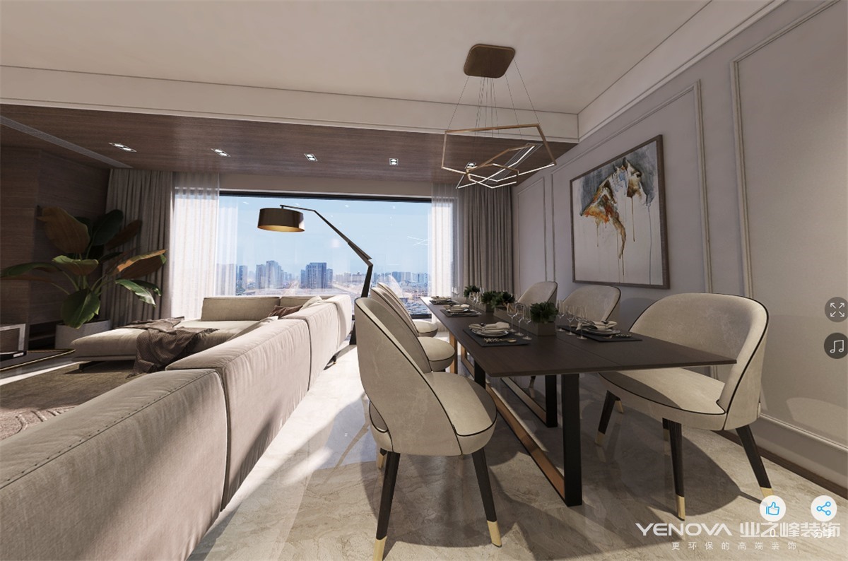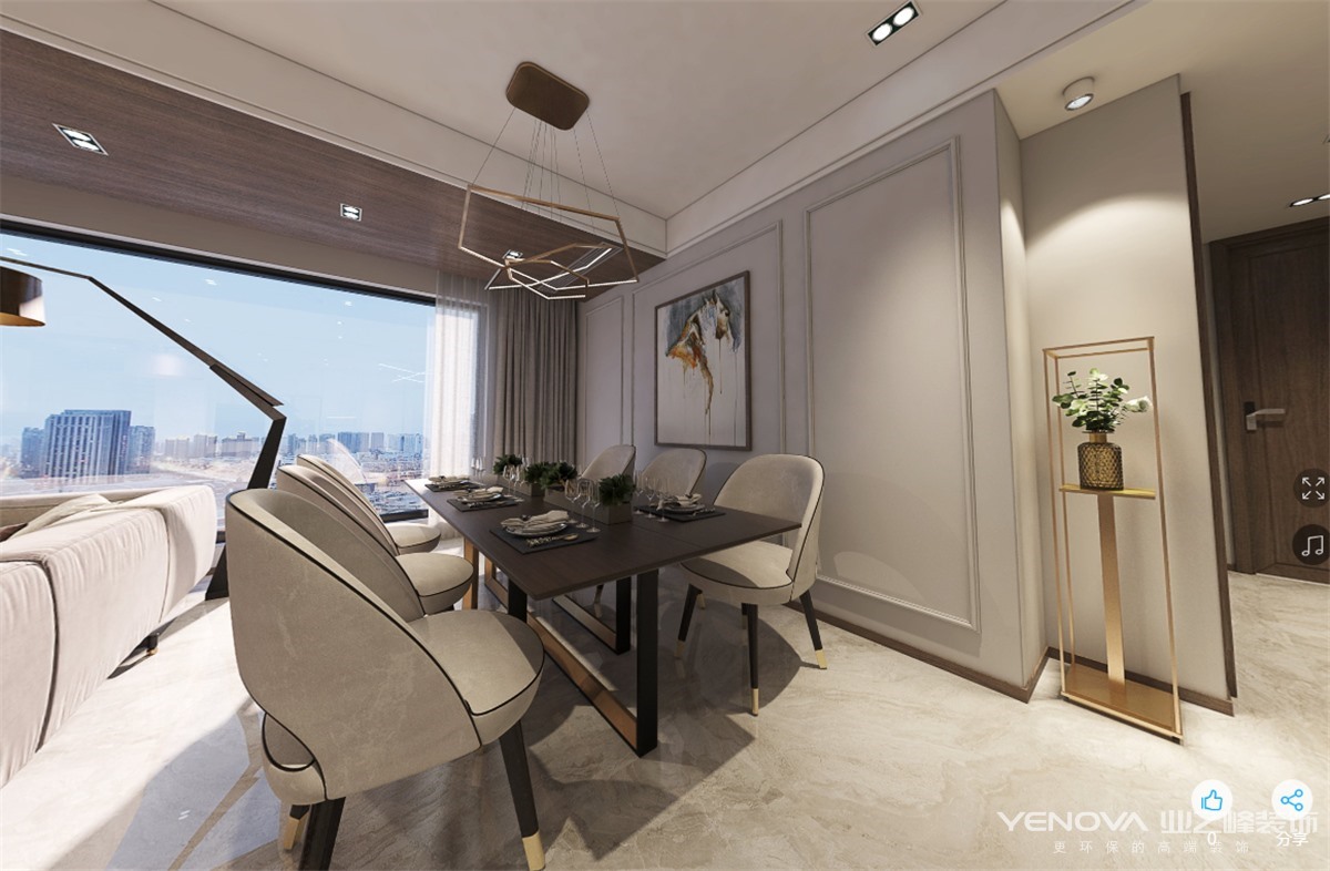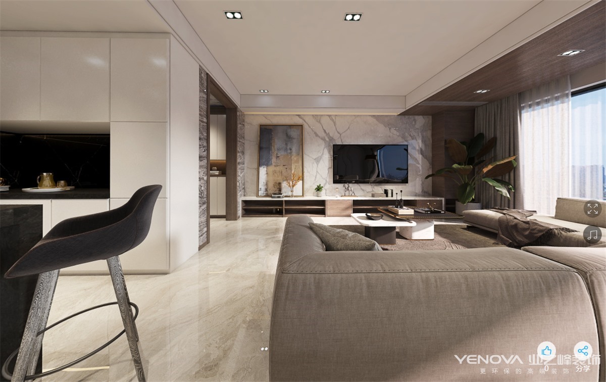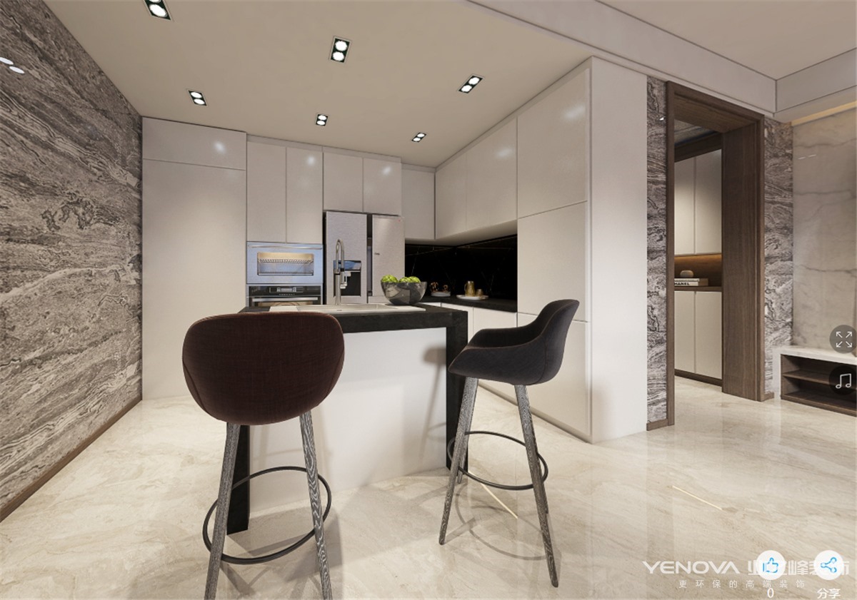 本案特别选用了现代轻奢的设计主题。在有限的空间极大地利用了每个区域。入门鞋柜选用定制高柜,不仅仅有收纳鞋子的功能,还可以储存生活的杂物,为空间增加了储存空间。入户门厅为了考虑到客户后期换鞋的舒适性,为其设计了一个换鞋凳,以备客户的日后之需,也不失美观性。客餐厅选用地砖铺设,因为考虑到公共区域平时是经常活动的区域,使用了地砖,便于打理。另一方面用地砖也巧妙的整合了整个客餐厅空间,因为空间布局的特殊性,客餐厅之间并没有用厚重的砖墙做隔断,选用沙发背作为两个空间的虚隔断,巧妙的划分了客餐厅空间,满足了客餐厅不同的使用功能,同时也让空间更加宽阔,实用又巧妙。此案设计中厨房采取开放式,借助整个客餐厅的光线,整个厨房更加明亮,使整个餐厅和厨房空间之间更加通透。客厅的电视背景墙采用整墙奢石的设计,让空间层次更丰富,也营造出了整个空间的高级感。客厅空间纵深较长,在设计中选用长型的“L”型沙发,很好平衡了整个客厅空间的格局,使空间更加宽阔敞亮。整个空间没有用繁复的线条去塑造,空间给人感觉整齐干净,从设计师的用色和用材质感上能感受到空间的高级之感。