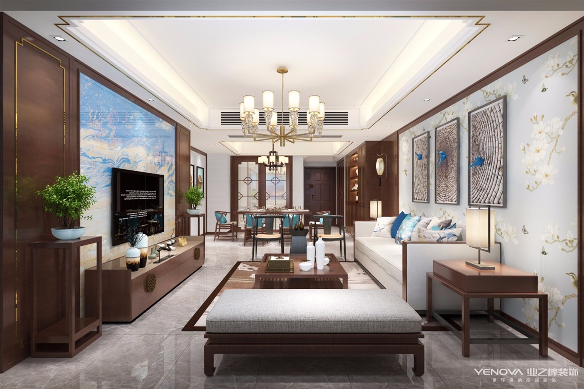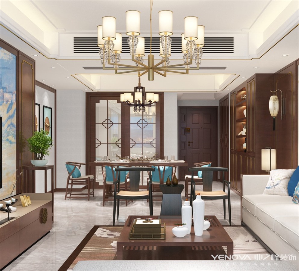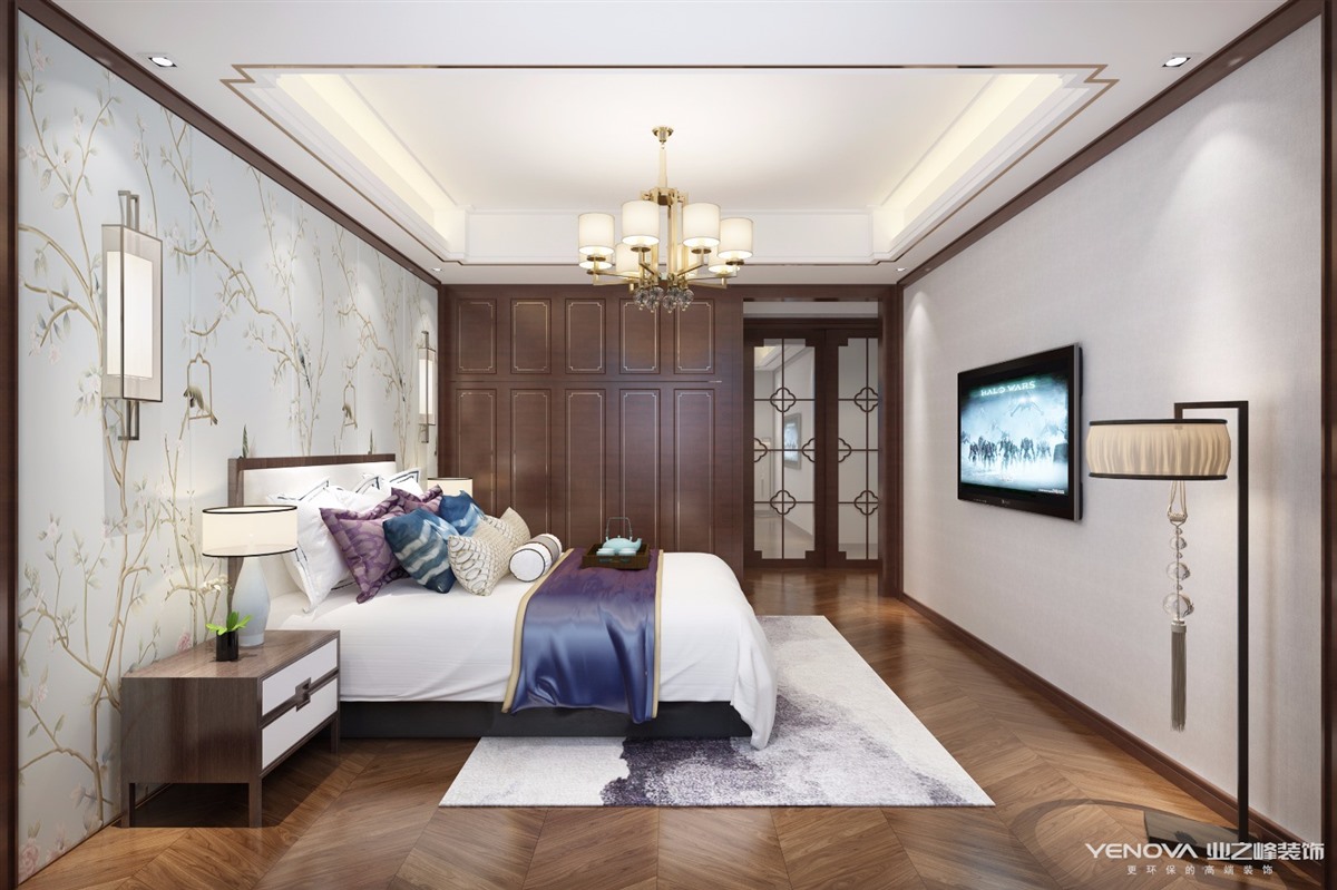 本案为整体风格定位为新中式风格,其男主人对中国古典文化情有独钟,而女主人则对现代轻快简洁风格有所偏爱。针对两位年轻业主的特点,于是本案在风格设计元素上也使用了一部分现代元素的设计,在整体中式风格不变的情况下保留中式风格的层次感。那么在设计中式风格的层次感上我们使用了中式的木门,窗棂,工艺化隔断,通过这种新的隔断方式呈现出单元式住宅的层次之美。再添加中式元素,使整体内容更丰富,显示出“大而不空,厚而不重”之感。餐厅乃连接各处空间的根本,所以在客餐厅上更要体现出新中式的特点。例如设计师结合古典中式的装饰元素,以沉稳的木色调为主,电视背景墙使用大面积的白色铺色,电视柜选用米白色大理石悬挂,与深色的木地板材料对比,相得益彰;卧室采用轻快简洁的现代元素,呈现着时尚的特征,在配饰选择方面更为简洁,减少奢华厚重之感,为了给卧室添加些许暖意,我们采用配上木饰壁灯以及精致的挂画。其中卧室也是起居室,居住更不能忽略环保这一重要因素,搭配上我们的环保的艺术涂料,在布光上采用柔和的色调,突破了传统中式照明的烛光环境,采用的是简洁几何造型的灯具。在满足衣帽间的使用功能情况下,设计师在设计衣帽间的基本功能上增加了业主的休闲区域。衣柜板材使用的是环保的澳松板,在环保的基础下有一定的造型,使得衣帽间不仅仅成为一个储物间,而添加了一些视觉上的享受。