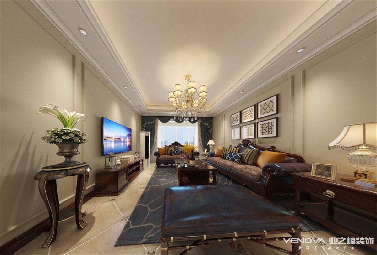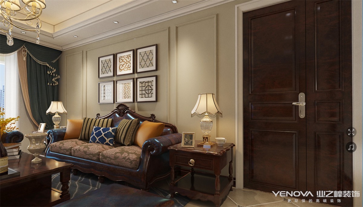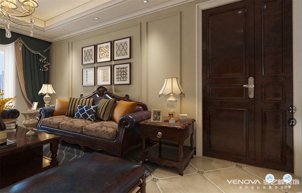 本案特别选用了美式的设计主题。在有限的空间极大地利用了每个区域。客厅采用石膏吊顶,搭配精致的水晶吊灯,营造出一种怀旧、浪漫的感觉。以仿古地砖作为地面装饰材料,质感极佳,在沙发区域铺上大幅花纹地毯,使空间划分更加清晰。复古造型的组合沙发,以及茶几都具有上乘的质感,让美式风格得到进一步的彰显。电视背景墙采用墙板,让整面背景墙更加立体,更加美观。客厅窗帘选用双层设计,一层为奢华提花布,另一层则为轻薄的纱帘,兼顾了保护隐私与透光性。餐厅还是采用与客厅一致的仿古地砖,客餐厅连成整体,空间更显宽敞。在餐桌旁边设有一个餐边柜,上面一部分选用带玻璃的平开门,可以放工艺品和酒,能起到一个装饰性的作用,下面一部分采用带装饰线条的门板,可以搁置生活中的杂物,既达到了功能性,也达到了美观性。厨房是采取开放式,与餐厅成为一个空间,让厨房操作空间更加充裕。