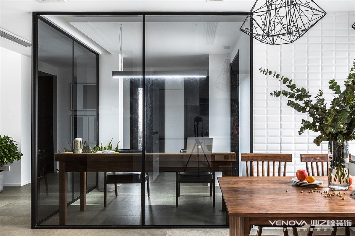 玻璃隔断的空间是一个明朗的书房区域,空间之间的互动性更强,视觉和光线更好。
