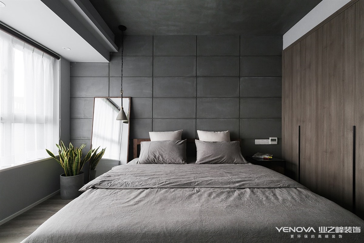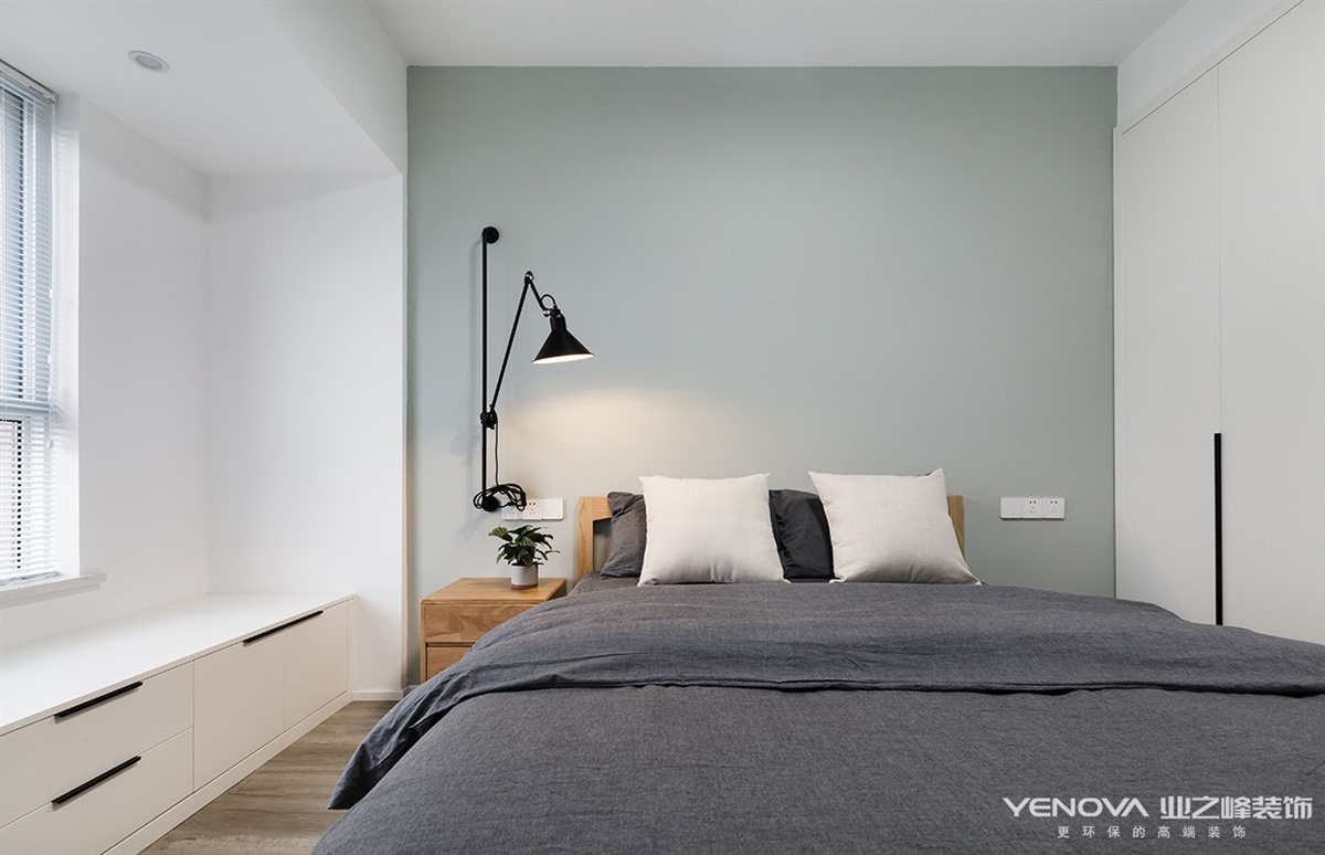 次卧更为简约,原木色的家具搭配灰色的床品,柔和且有质感。