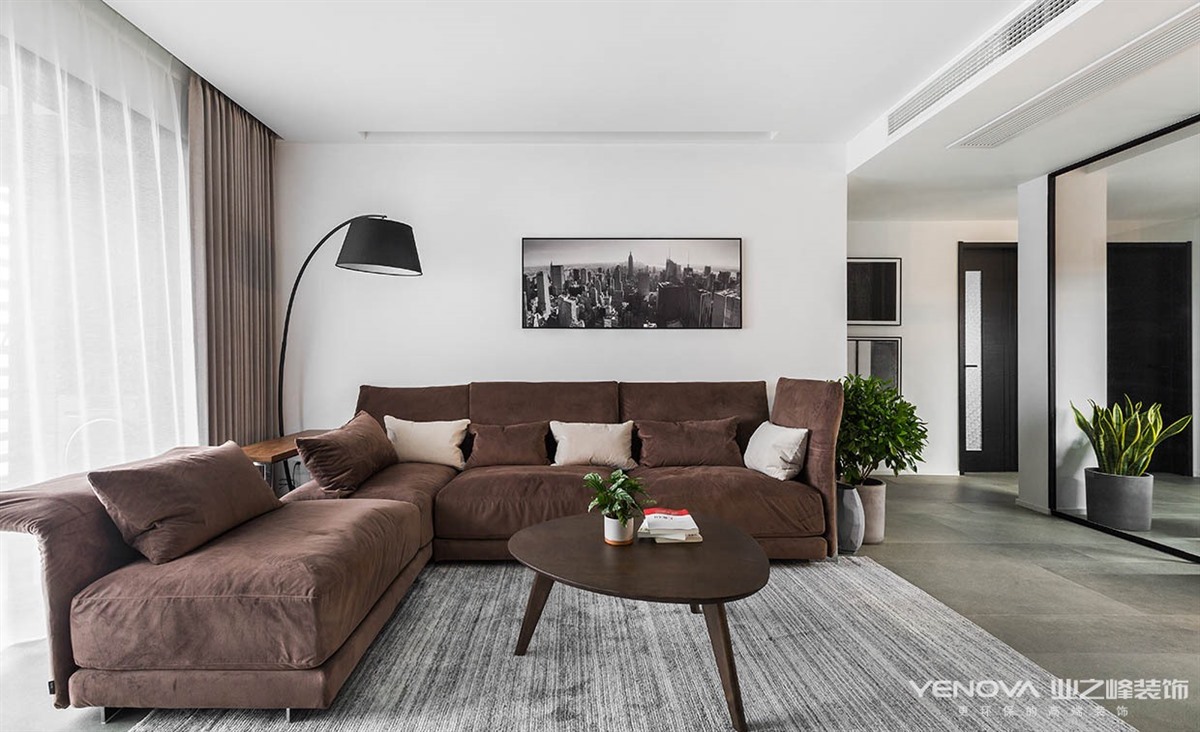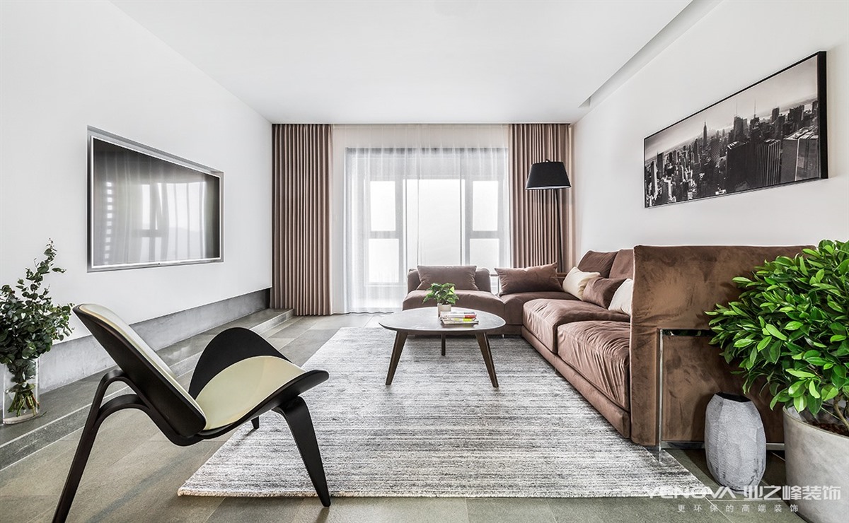 极其简单的硬装,大白墙、灰色的地砖、灰色的地毯、实木的茶几、棕色的布艺沙发,稳而不沉的色彩体系,用地台代替电视柜功能,放置一盆绿植,让人感觉家的温馨。