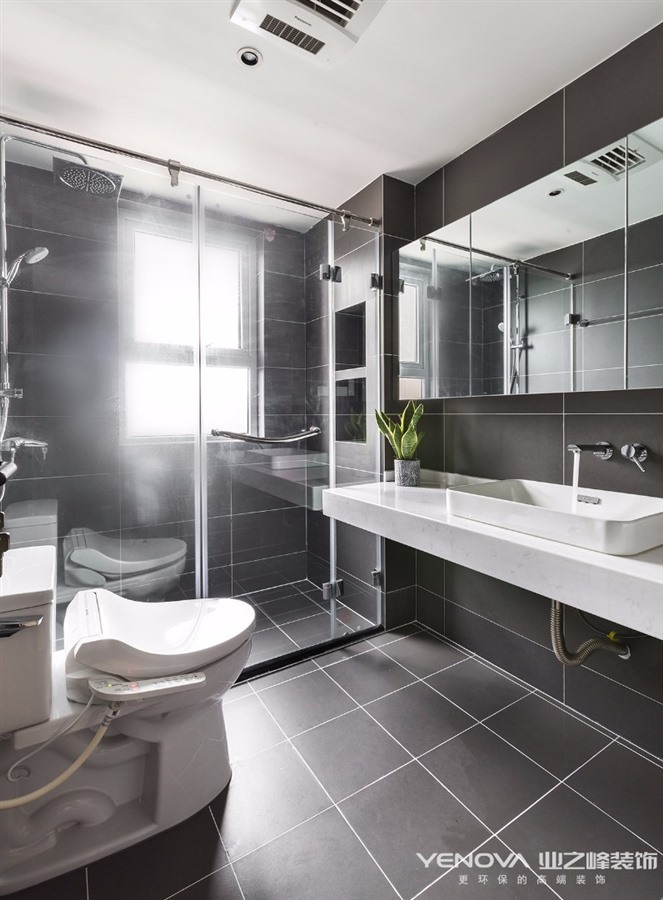 卫生间采用玻璃淋浴隔断,大气简约,灰色调的砖跟白色的卫浴很是般配。