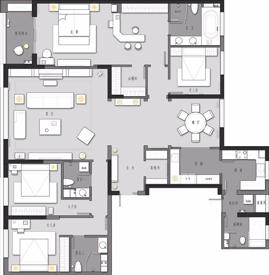 中西厨的界分、吧台的设置,既解决了中式烹饪的油烟问题,也让更多的家人可以参与到美食的制作当中,厨房不再是简单的饮食操作间,而是全家的共赴餐宴的游艺场。可以随意调节的客厅座位,茶几位,既满足了全家欢聚交流的空间需求,也为家庭影院的观看提供了舒适的位置,充满了灵活多变的可能性。总之,这不是一套冷冰冰的房子,而是充满故事的家。