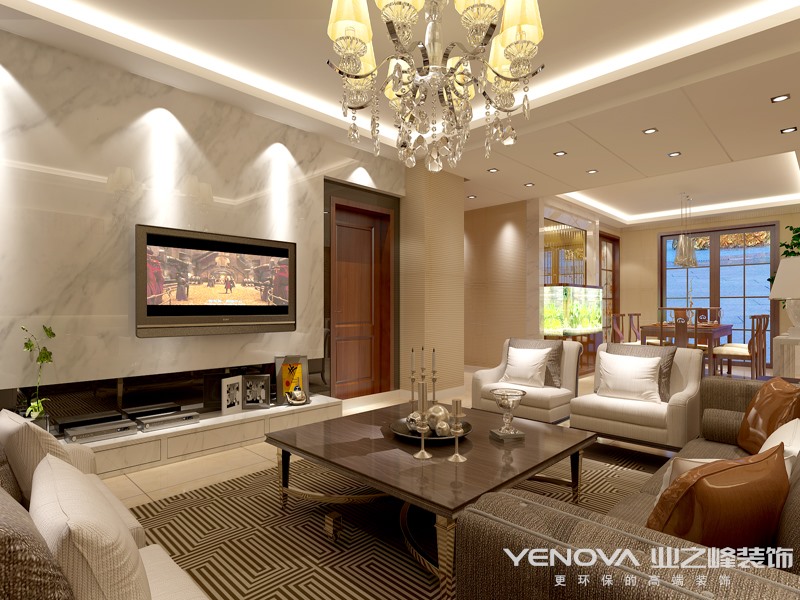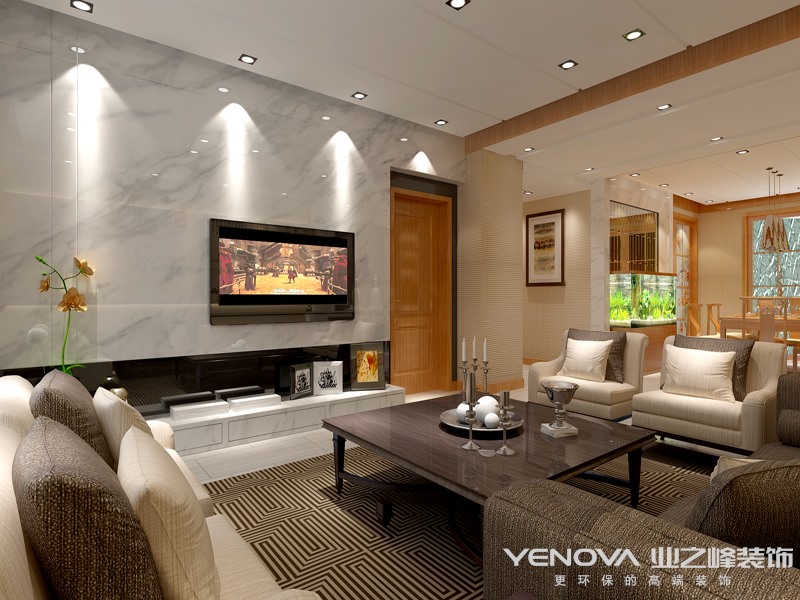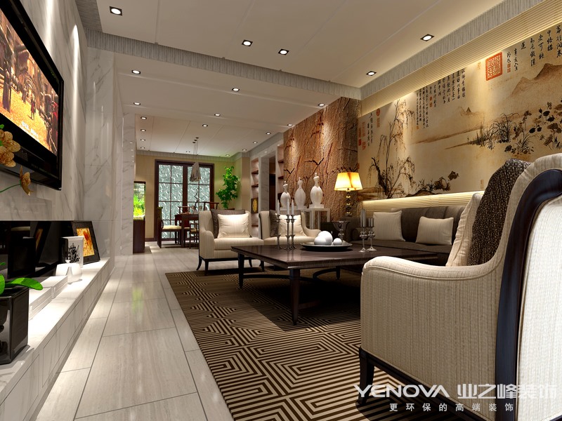 新中式风格是目前把中国传统风格揉进现代时尚元素的一种流行趋势。这种风格既保持了中国的传统,又有时代感,突破了中国传统风格中沉稳有余,活泼不足等常见的弊端。新中式风格不是纯粹的元素堆砌,而是以现代人的审美需求来打造富有传统韵味的事物,让传统艺术的脉络传承下去。所以 设计师在电视背景墙上大面积运用了瓷砖,显得整个空间通透而明亮。其次是在灯光的运用上,大面积使用射灯和无主灯的设计可以很好地烘托出氛围。双方选用了实木与布艺相结合的新中式沙发,简约大气。