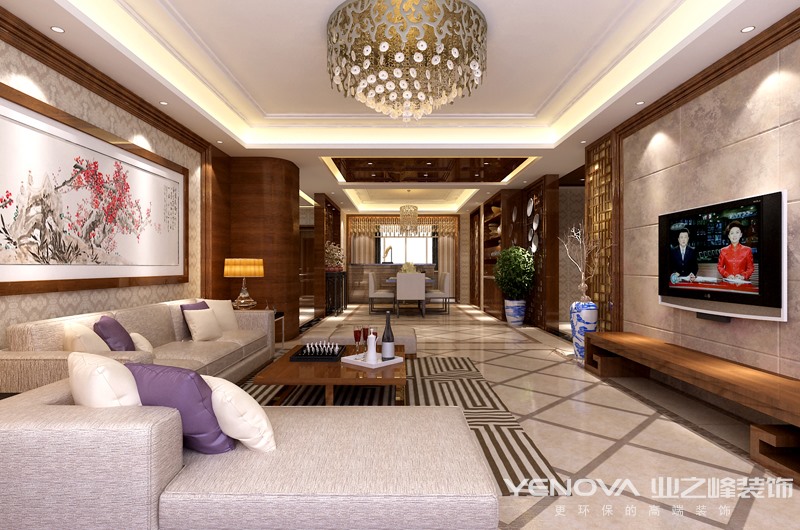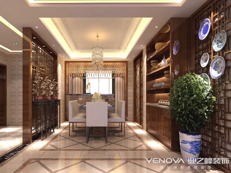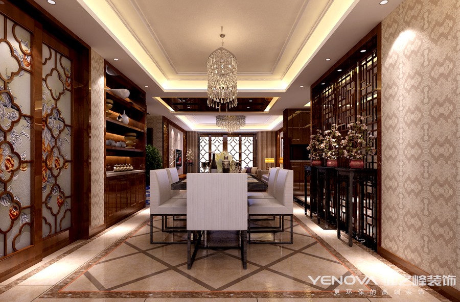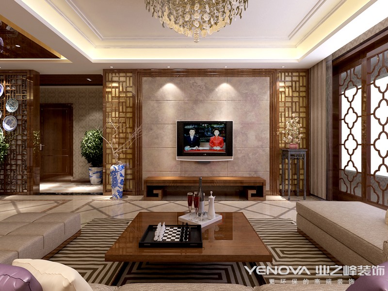 在设计时,设计师为住宅选择简洁、硬朗的线条设计。中式设计虽然在图案上要求精致,但是在装修结构的线条上追求简洁,而且多样式的线条可以使空间显得有层次感。在设计本套户型中,设计师对于色彩的使用也是很有讲究的。一般来说中式设计风格住宅使用的颜色多为深红、棕色等颜色,主要为了打造一种沉稳厚重的装修效果。其次,红色寓意吉祥,象征着美好的寓意,所以在