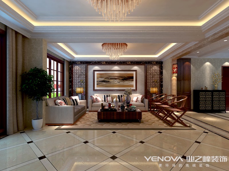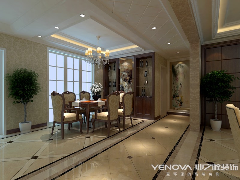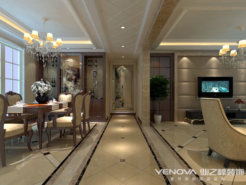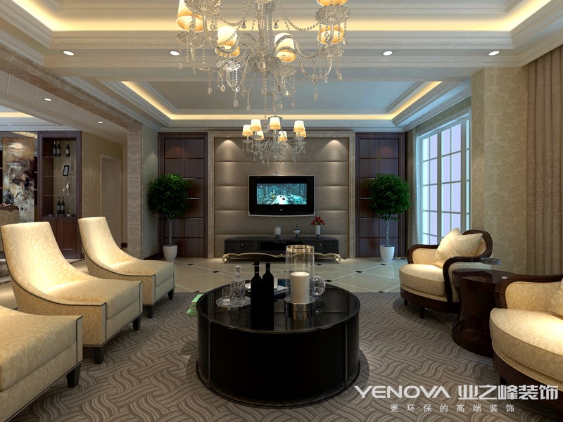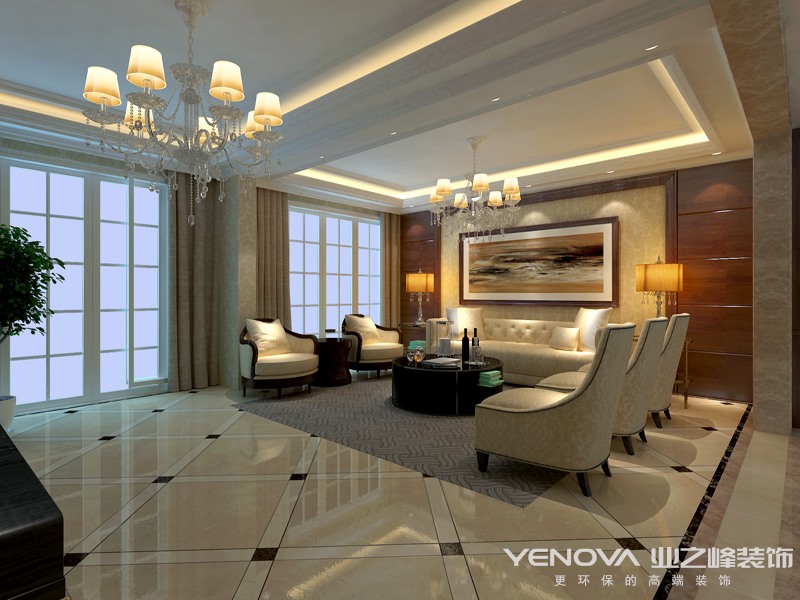 设计师在设计时选用了大面积的黄色系装饰空间,使得整个空间看上去华丽,优雅。家具选用的是欧式简约的布艺沙发,搭配经典的线条地毯,使得整个空间更加温馨。在欧式造型中,柱的设计也很有讲究,关于门的造型设计,包括房间的门和各种柜门,设计师在设计时既突出凹凸感,又具有优美的弧线,两种造型相映成趣,风情万种。