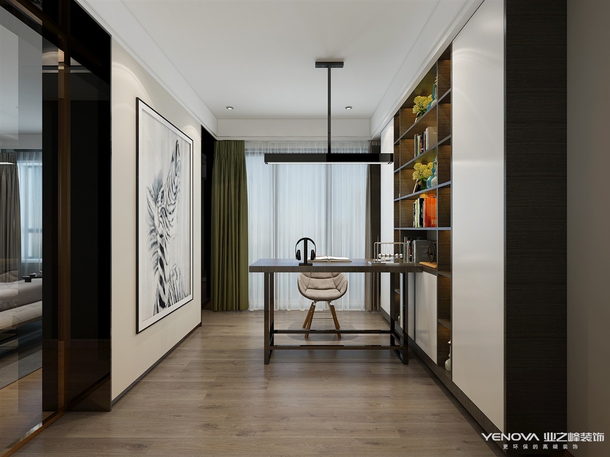 客厅采用石材上墙与木饰面结合的方式,简洁大气,不失精致。餐厅的餐边柜采用金属和玻璃相结合的方式,使整个空间更加现代干练。房间背景墙采用软包与金属线条的结合,能体现客户的生活水平,主色调上沿用灰色系与木色结合,色调上显得比较雅致宁静。主卧通过结构改动,拥有一个衣帽间以及书房,更能体现客户的生活品质。
