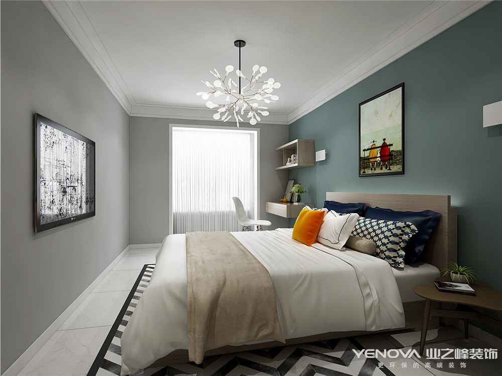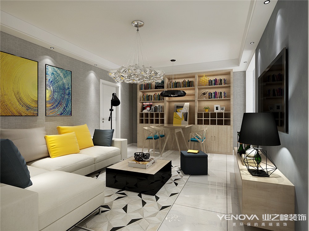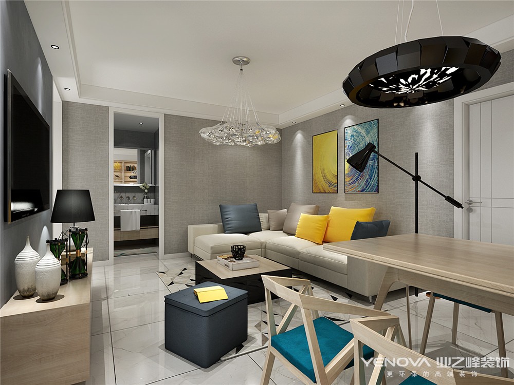 该业主单身男士,在律所工作,平时在家喜欢看书,工作上严谨,生活也是条理分明,喜欢简单又显精致的感觉,所以,整个空间的色彩搭配以暖灰色系为主,搭配原木色,点缀于蒂芙尼蓝,以及暖黄色!整体表达了一个时尚,干练的色彩感觉!客厅的地面选择了现在主流的全抛釉的爵士白的大地砖,客厅的墙面为了凸显质感,选择了灰色的壁纸.考虑到回家后可以窝在沙发里看电视小憩,所以选择布艺,提高了整体的舒适度!