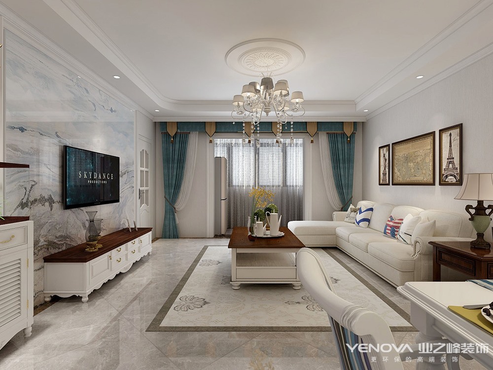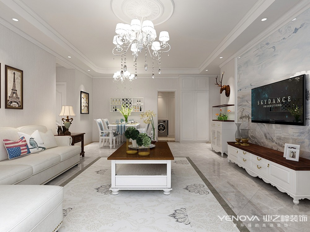 在美式风格设计中,也不会采用过多的色彩。为了凸显其贵气与端庄,在美式家具的油漆上,一般都以单一色为主。整套美式风格装修设计的家居环境中,大多都是统一色系的装修色彩。客厅作为待客区域,一般要求简洁明快,同时装修较其它空间要更明快光鲜,通常使用大量的石材和木饰面装饰,美国人喜欢有历史感的东西,这不仅反映在软装摆件上对仿古艺术品的喜爱,同时也反映在装修上对各种仿古墙地砖、石材的偏爱和对各种仿旧工艺的追求上。总体而言,
