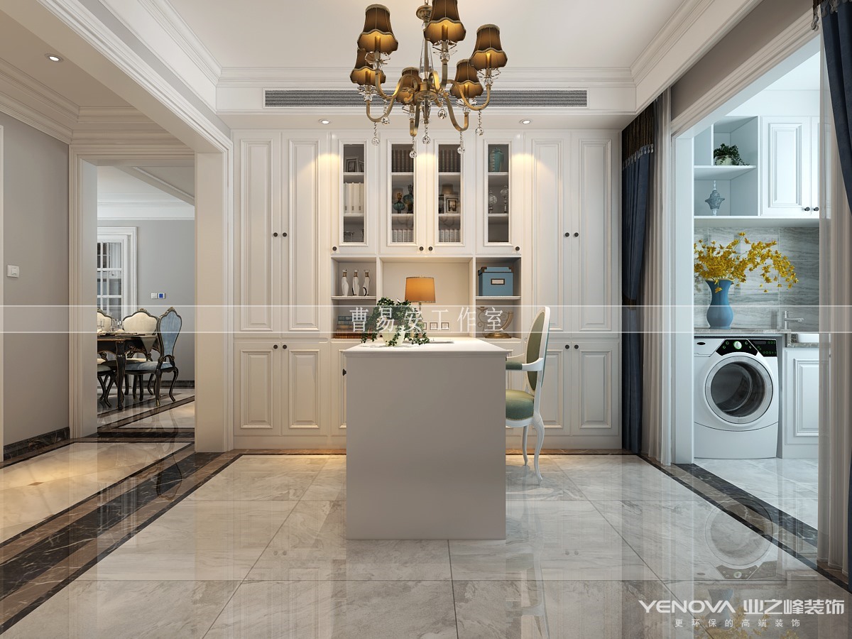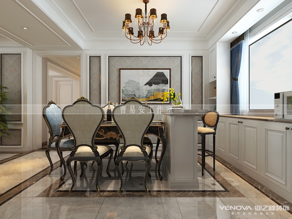 客厅餐厅连为一体,通过地砖材质和顶面造型来划分空间主次,使用石材、线条等丰富空间的造型。用复古的欧式纹路与造型刻画出细腻的层次,融入空间,使整个空间低调内敛而不失华贵雅致。金属质感的装饰恰到好处提升空间的档次。装饰画、陈设,整体色调的搭配,大方又不失典雅。