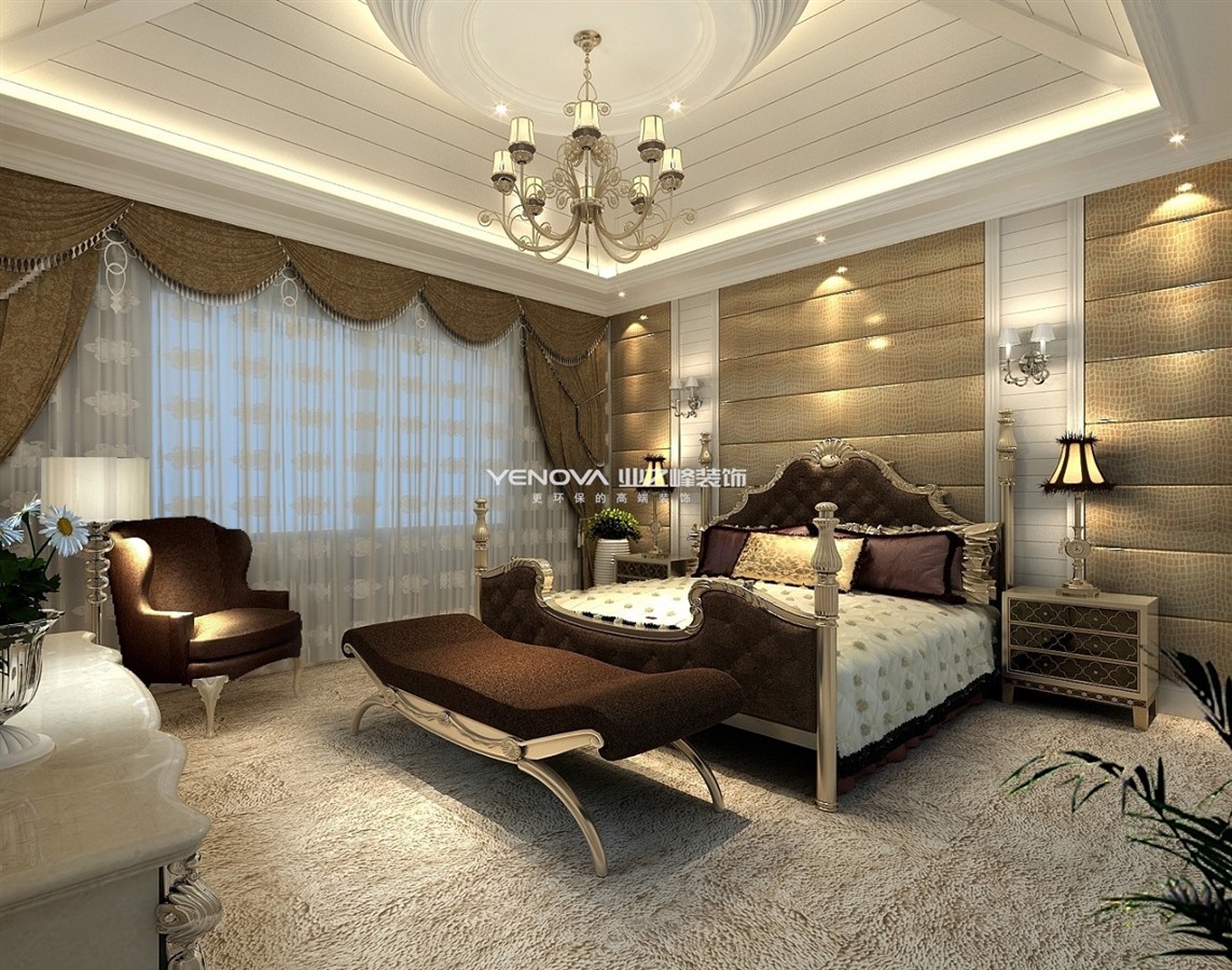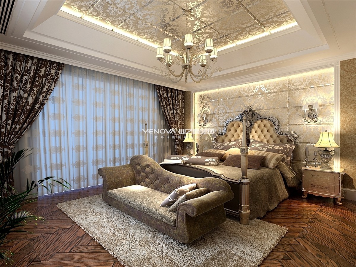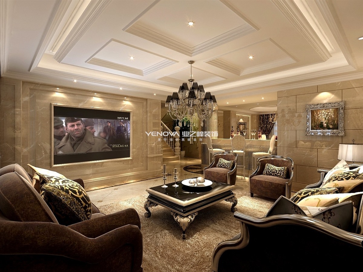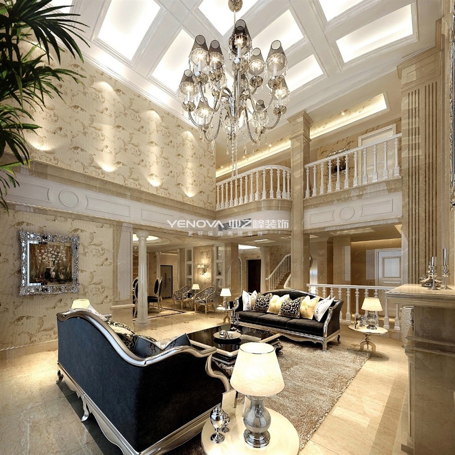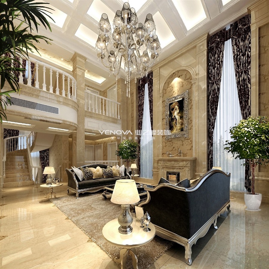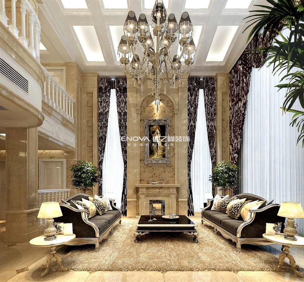 本案以欧式风格为主 偏向古典主义 在把握整体空间上尽量和谐与统一 造型上简洁而不失奢华 色彩上既厚重又不压抑 优雅的设计风格会让人多一份温馨与感动。客厅挑空的设计让空间显得庄重而高贵,光感的顶棚设计,让室内仿若与室外相同的感觉。