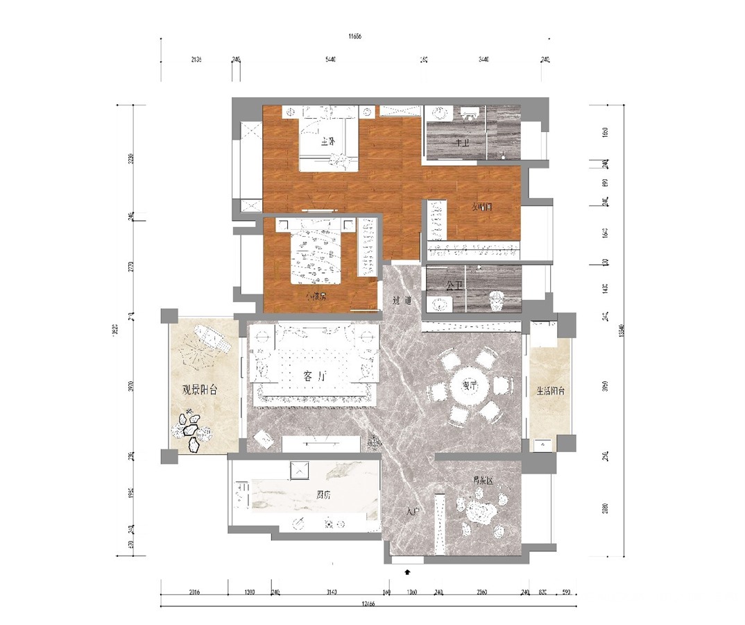 本案的主题为简欧风格,大理石电视墙造型与四周墙面瓷砖相呼应,欧式风格金黄色是不可或缺的重要元素。在本案例中,以陈设低调艺术品及大理石线条材质来营造大气、自然、简约不简单很好的诠释装饰美学氛围。