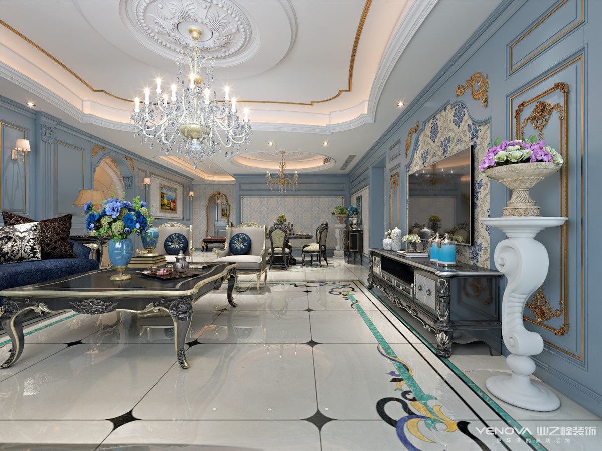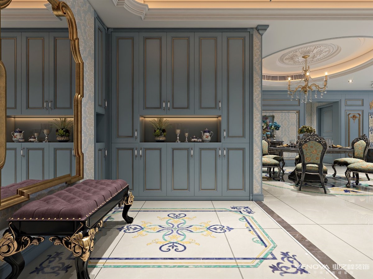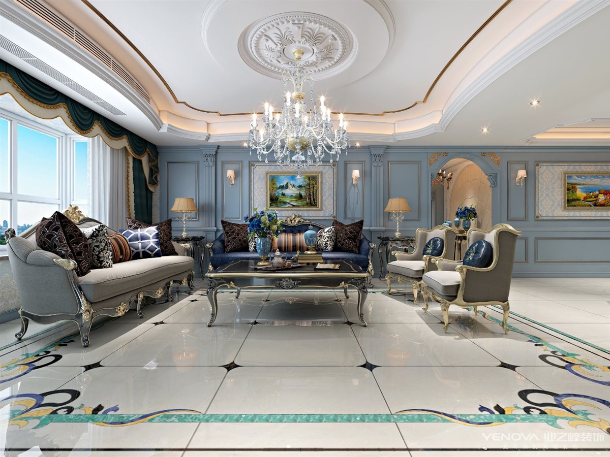 设计采用“浪漫法式”风格,以蓝灰色作为空间主色调,米色金色点缀其中。通过材质与色彩的完美搭配,打造出一个富有“现代都市”风的样板空间。墙面的墙板处理;顶面细腻的收口关系;地面丰富的瓷砖细节;璀璨的水晶吊灯;黑金高端家具配套;迷人的风景画......一切都彰显了法式空间的品味,营造出了浪漫的法式意境。