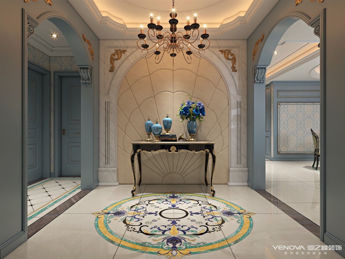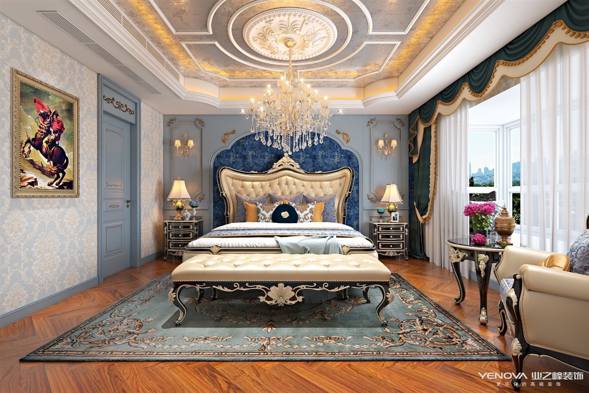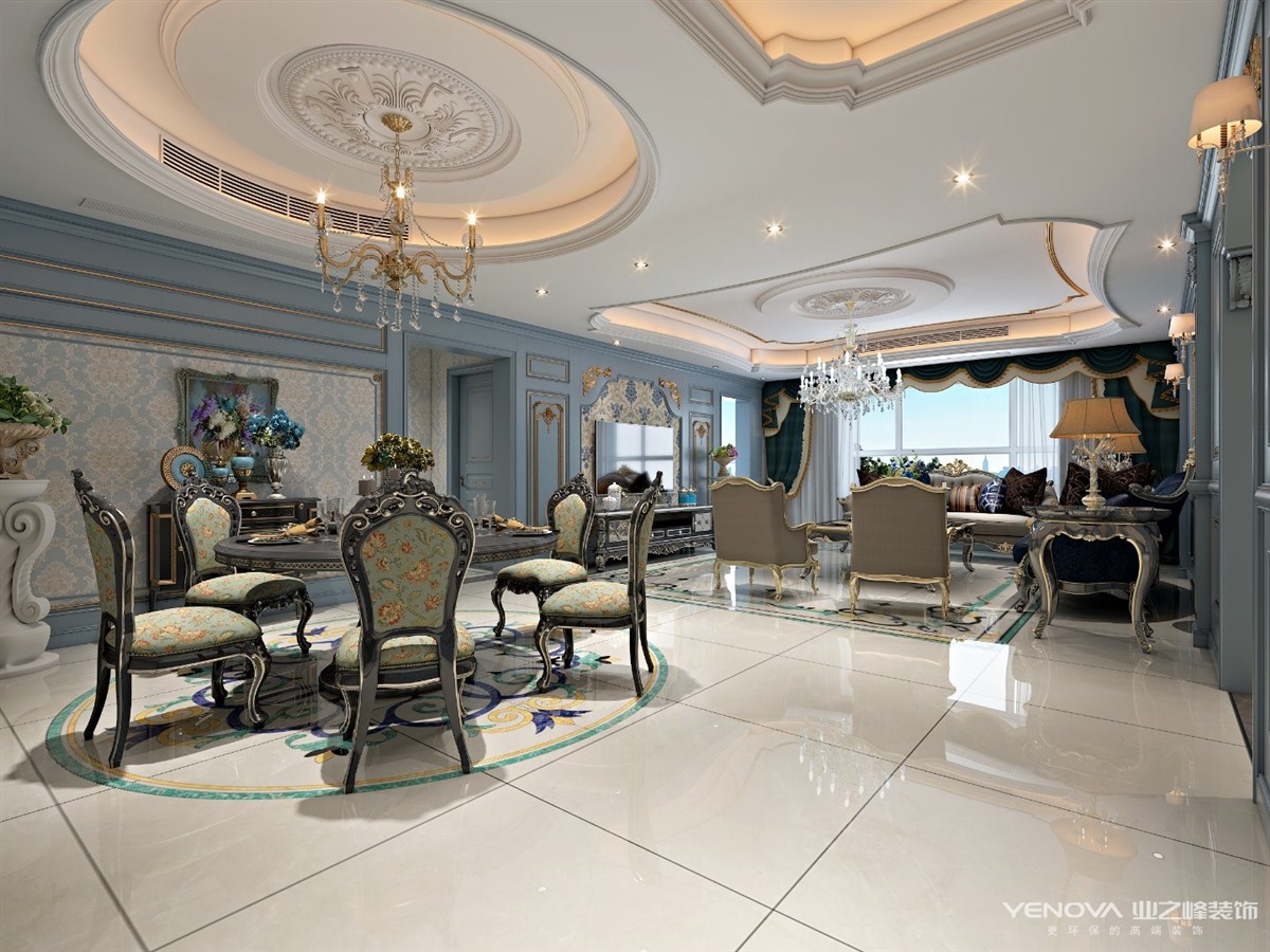 设计采用“浪漫法式”风格,以蓝灰色作为空间主色调,米色金色点缀其中。通过材质与色彩的完美搭配,打造出一个富有“现代都市”风的样板空间。墙面的墙板处理;顶面细腻的收口关系;地面丰富的瓷砖细节;璀璨的水晶吊灯;黑金高端家具配套;迷人的风景画......一切都彰显了法式空间的品味,营造出了浪漫的法式意境。