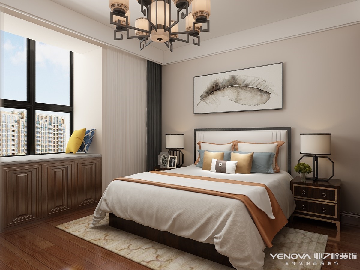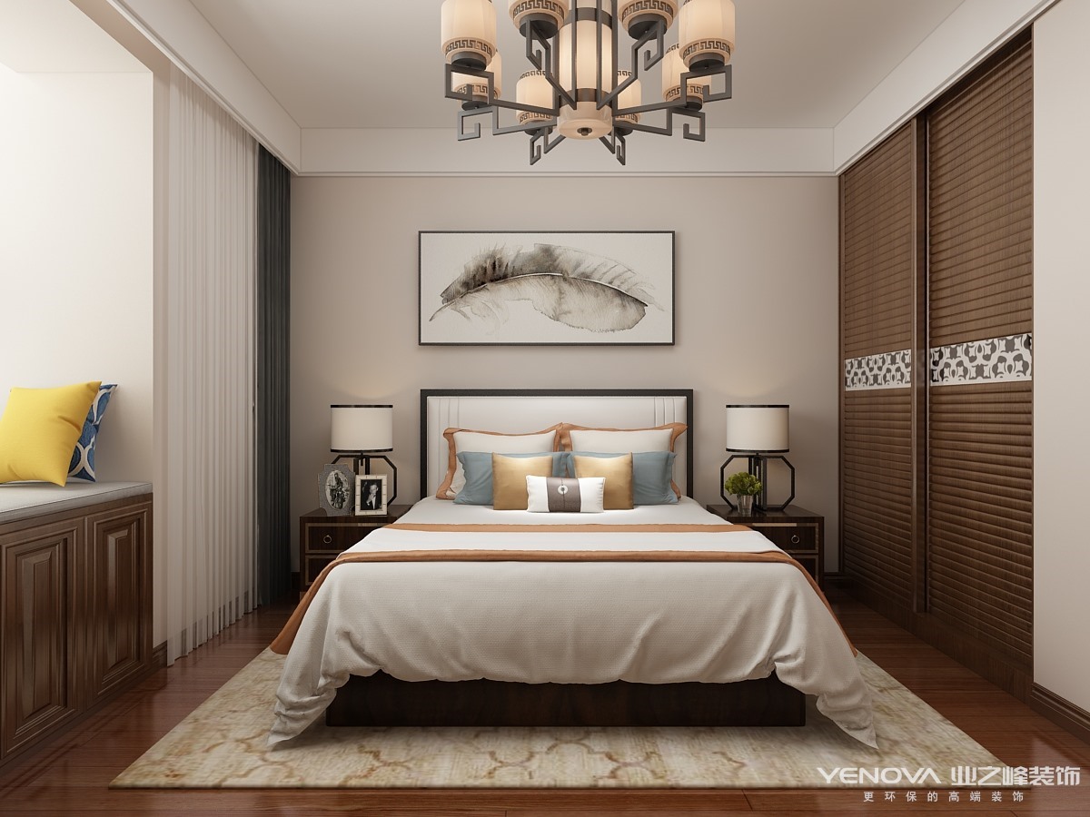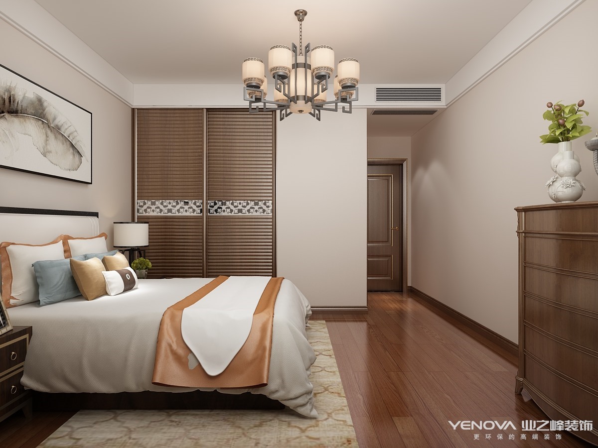 新中式风格非常讲究空间的层次感,本案例依据住宅使用人数和私密程度的不同,做出了分隔的功能性空间,一般采用“哑口”或简约化的“博古架”来区分;在需要隔绝视线的地方,则使用中式的屏风或窗棂,通过这种新的分隔方式,单元式住宅就展现出中式家居的层次之美。简单舒适的卧室,可以让业主放下一天的疲惫,简单的床柱让业主更有安全感。