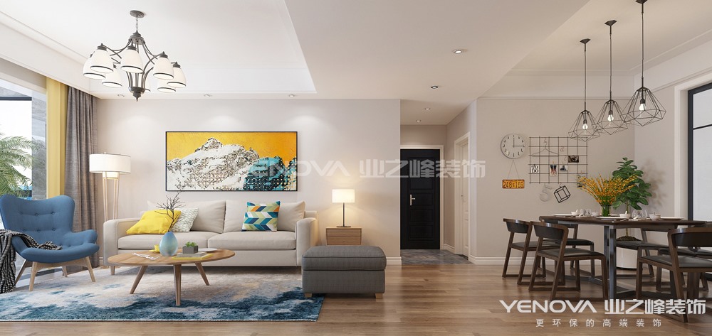 本案为南阳凯旋公馆136平米现代简约风格装修效果图。整体色调明亮轻快,让人能够在繁杂的工作后有一个轻松明快的心情。布艺沙发靠椅让人感觉舒适温馨,餐桌餐椅木质的材料让人仿佛回归本真,而餐桌上的花朵,墙角的绿植更让整个空间活泼起来。墙上的装饰以及吊灯都采用大方时尚的风格,更映衬了现代简约的本质。卧室的植物装饰画让整个房间都清新自然,也为整个浅色调房间增添了一抹亮色,地板也采用木质的材料,更加有率真质朴的感觉。