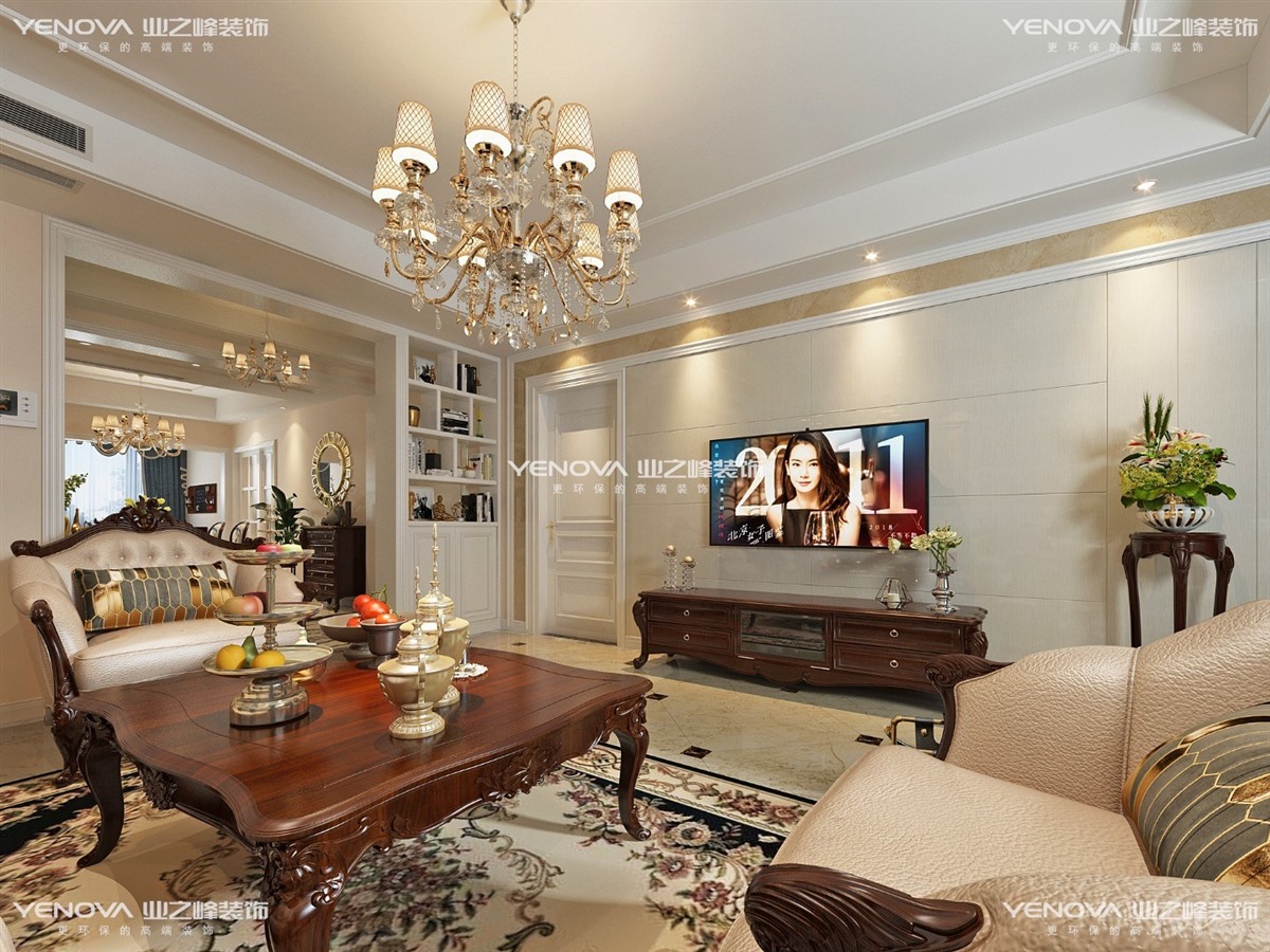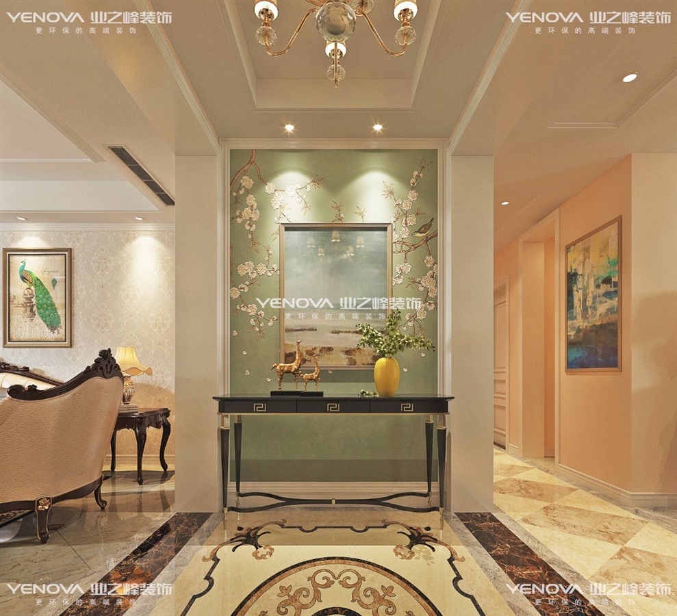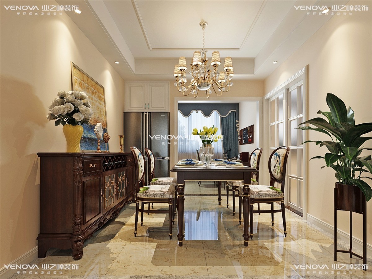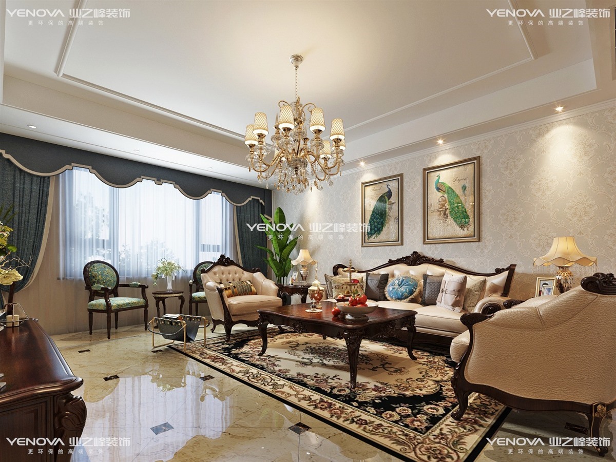 本案设计色彩主调为白色、黄色,家具为古典弯式腿,家具色彩以深色为主,门窗漆成白色营造出华美、富丽、浪漫的气氛。