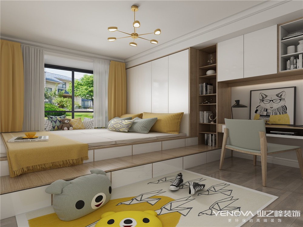 灰色为主色调,加入原木色的调和,再用抱枕和毯子点缀些许低饱和度的亮色,使空间不再沉闷,整体清新而简约;框架式的铁艺茶几可以放置一些书籍、绿植和香氛,实用而美观,客厅照明用灯没有采用大的欧式吸顶灯,而是采用富有设计感的立方体小射灯,沙发旁富有创意的落地灯,将简约优雅与现代个性融合在一起,更显空间质感;飘窗的加入为餐厅又增加一份闲适,可以在阳光好的时候,躺在上面看书小憩,享受属于自己的闲适时光,下方的隐形储物柜也方便存储日常杂物,旁边的阶梯式书架可以放置各具特色的装饰品和绿植盆景,增加了空间的储物功能。