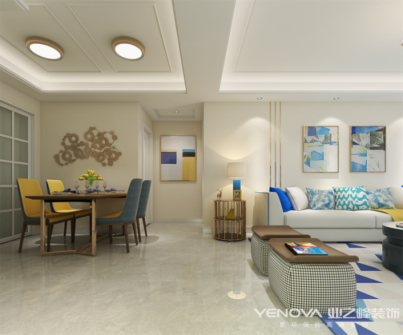 本案是水墨嘉苑小区的作品。业主是即将结婚的情侣,充满了对生活的热爱。本次设计的初衷也是给他们一个明朗、清新的感觉,蓝色能让整个空间显得利落脱俗。简练的线条让人百看不厌。书房应用了隐形门,让电视背景墙变得完整,也让空间利用率大大提升.