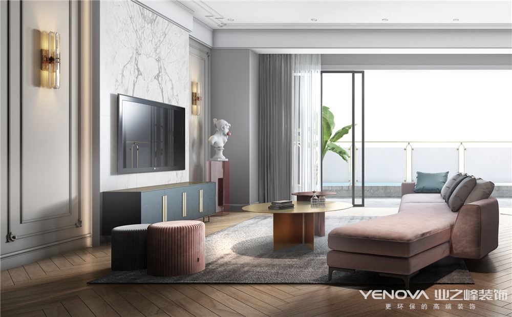 半透的玻璃门,给客厅带来充足的光线,半隐的效果,虚化了背景,凸显了空间的精致玲珑。轻奢的古铜,时尚的玻璃,当代的抽象画,点缀优雅的摆件,为空间加分不少。简化了线条的石材电视背景墙,少了些繁琐,多了些时尚,背景的护墙板也没有太多浮夸的造型,看上去更加精美舒适,顶面内嵌的金属条又增添了几分精致感。