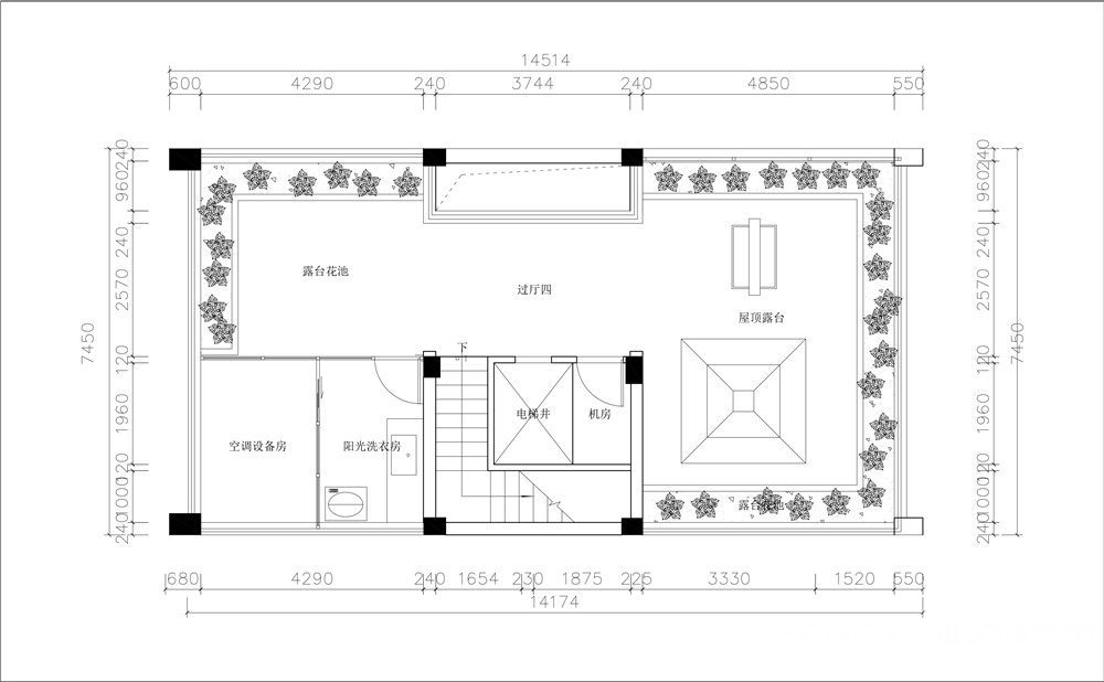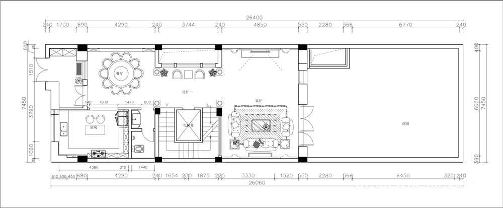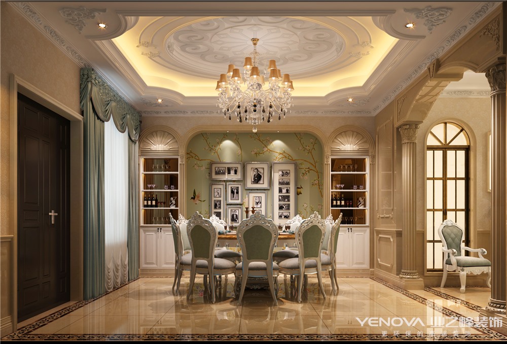 别墅的餐厅另有一番风味。最显著的特点就是空间高,设计没有改变原始空间结构,而以简单的装饰线条和几何形状将这种风格进行渲染,餐厅顶部的圆形欧式宫廷石膏花盘吊顶造型,典雅精致,搭配上水晶玻璃坠子的吊灯,给人以明亮宽敞的视觉效果。一幅“鸟语花香”的墙纸拼画作为相片墙背景,既温馨又舒适。