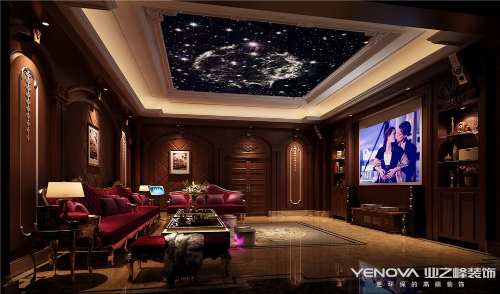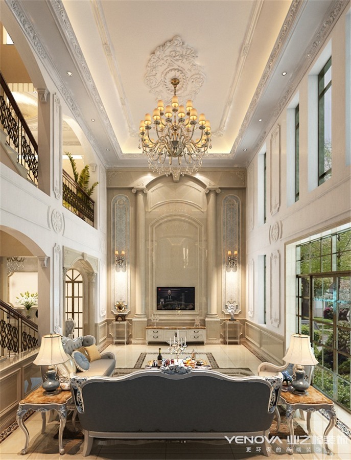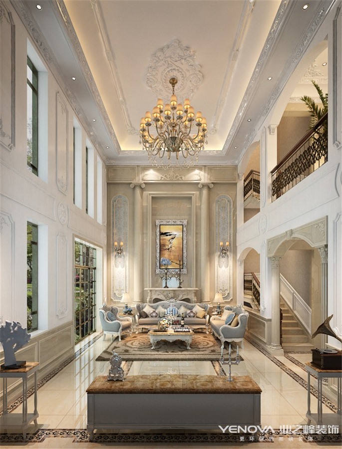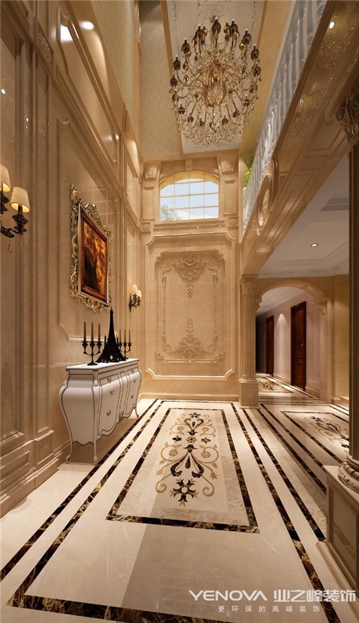 进入客厅,刻间便感受到一室的古典与华贵,奢华的水晶吊灯是客厅设计的点睛之笔。在暖棕色的地面大理石拼花的映衬下,淡雅的气息扑面而来。巨大的水晶吊灯、精致的烛台、唯美的石膏像、欧洲风景油画看似毫无规则地随意悬挂着……从细节到整体,每一处微妙的处理,都为空间带来了无限的灵性与贵气。