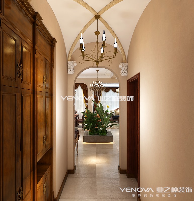 本案设计为美式风格。美式风格来源于欧洲文化,其风格并不过分强调繁复的雕刻,以舒适和多功能为主,但同时也不失怀旧、浪漫的感觉。别墅整体墙面为暖色乳胶漆,客厅地面为暖色仿古地砖,沙发背景墙为浅色传统美式造型,相互衬托营造出沉稳大气的感觉。卧室均采用美式元素搭配而成。次卫生间空间足够大,又因为它在负一楼,不经常使用环境相对私密,所以将其设计为汤池,又与健身区相隔不远,健身后舒舒服服的泡热水澡十分惬意。业主比较喜欢茶文化,所以在茶室的设计上与业主研究了好久,最终决定设计为中式茶室,既满足业主要求又有移步换景的效果。