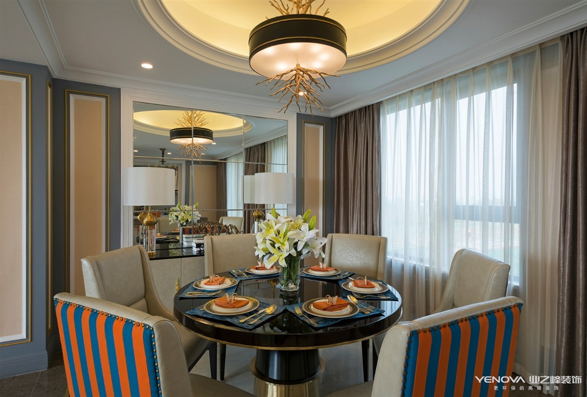 餐桌的位置在阳光明媚的地方,美式的圆形餐桌搭配亮眼的跳舞兰,一种浓浓的美式风情意蕴悠长。