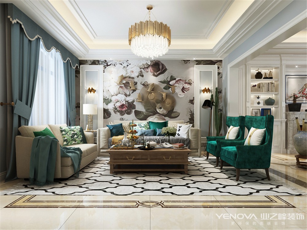 为满足空间的实用性和视觉感,对原户型进行了改造,将厨房和餐厅移至负一,从而一层客厅的区域更加宽裕。二层也推翻了原来的格局,打通墙体,将原来的独立书房改为一个及看书、交谈和看电视为一体的家庭休闲区。在材料选择上,客厅的沙发背景墙采用大花图案的壁纸搭配白色护墙板,用线条简洁的浅色家具搭配天鹅绒绿的单人沙发,进一步提升空间感。