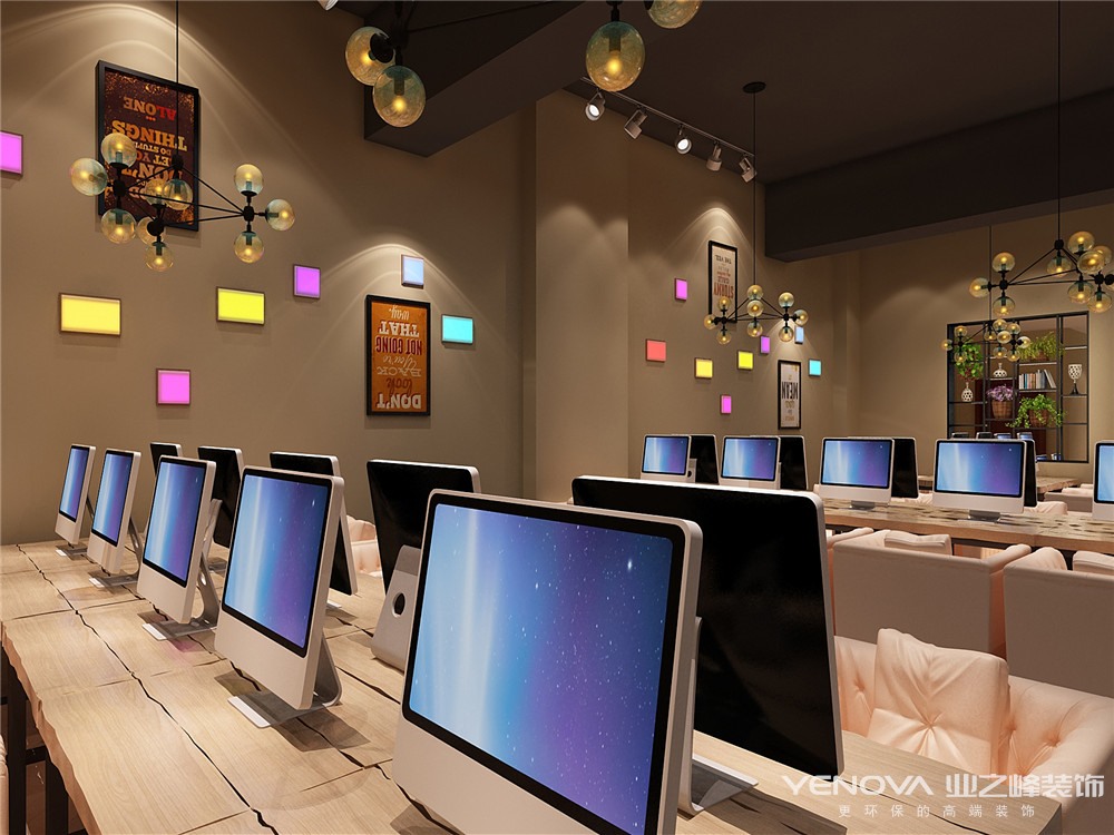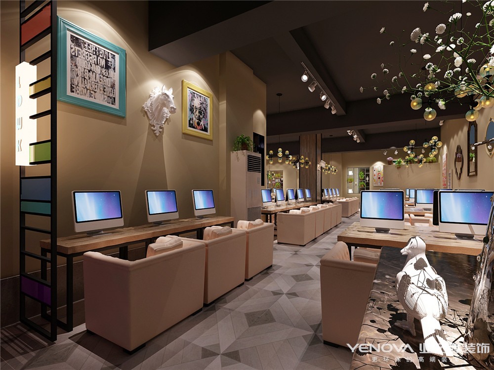 摒弃了传统网咖常用的重色调,以饱和度高的鲜艳色调创造休闲环境,结合了工业时代审美意象,最终定位营造一个现代的雅致空间。