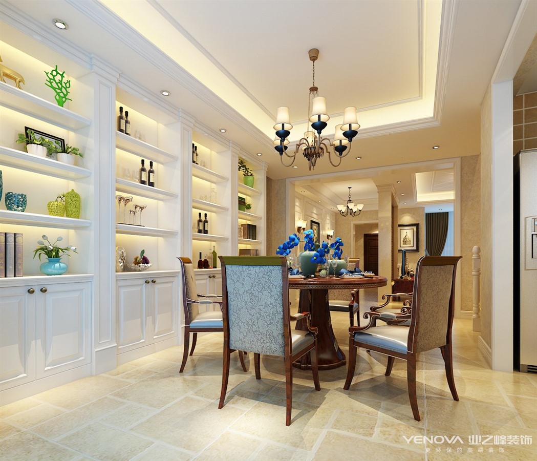 【餐厅】餐厅区域,餐桌选以深棕色带有雕刻装饰元素的家具,高低错落的灯池吊顶,黄色营造出华丽、愉悦的用餐氛围,享受片刻与家人的温馨时光。