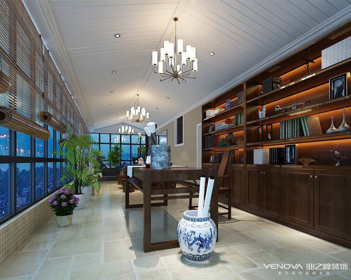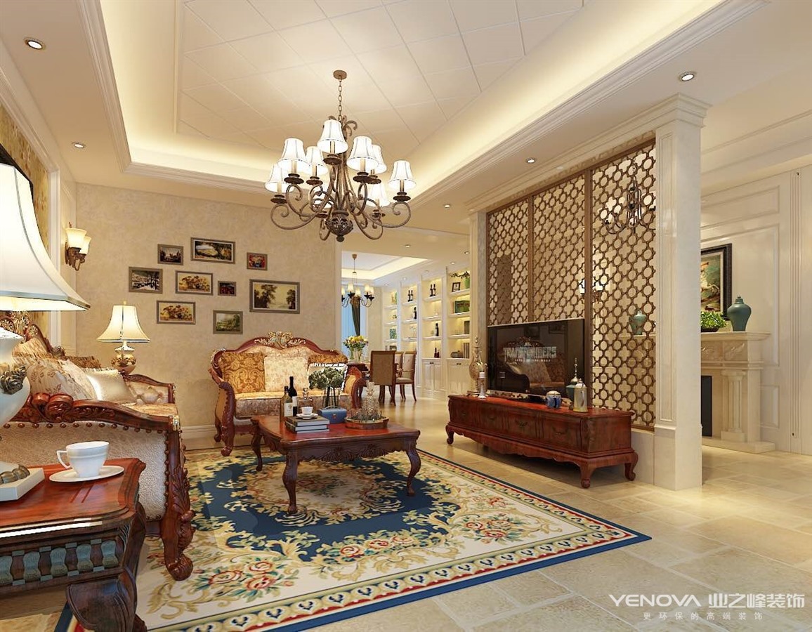 【客厅】 客厅采用镂空式隔断作为电视背景墙,空间隔而不堵,保证了空间透视感,墙面采用立柱装饰,顶面采用灯池跌级吊顶,线条轻快、明朗,赋予了空间层次感和律动感,选以精致的棕色家具,带有雕刻装饰,线条优美,稳重成熟又不失魅力,整体色调以黄色为主,很好的营造出非凡气度的空间氛围。