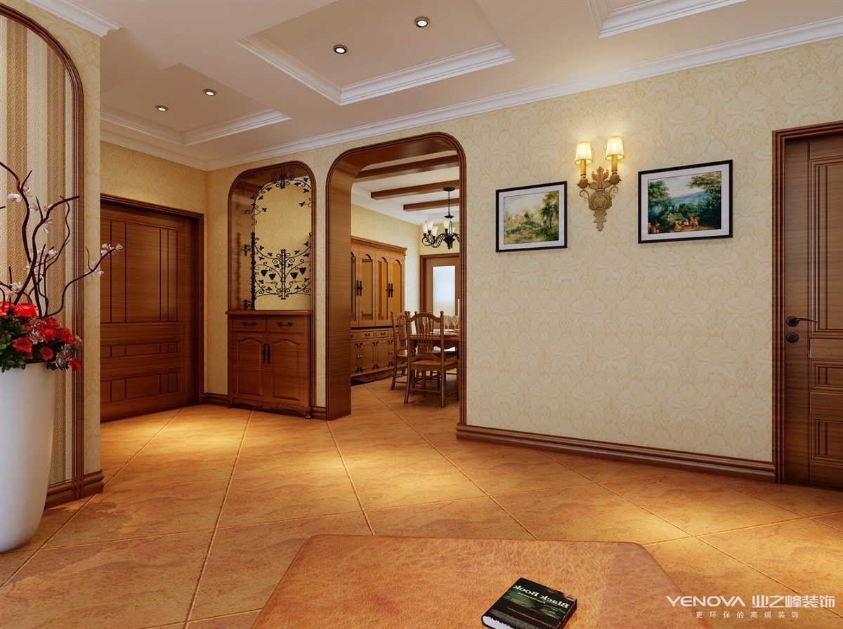 本案在结构调整方面比较小,只是把书房的南墙往北移位了一些,为的是让门厅、餐厅、过道空间各自为齐,同时也弱化了阳角的突出感。门厅与餐厅中间的垭口处理成了多功能型的结构,将鞋柜也容入了进去,铁艺的运用增添了一些古典美,又有些许的休闲之意,也突出了美式的历史感。作为待客区域的客厅,使用仿古砖和木饰面的护墙板做装饰,竖向条纹型的壁纸装饰的墙面,凸显着美式风格自由,富有历史气息的鲜明个性。宽大舒适的家具,无不体现着美式的元素。餐厅拱形的垭口,丰富了墙面的美感,粗犷的木梁装饰是对大自然诠释。主卧的装饰简单大方,在布艺饰品上做了考究的选择,将墙面护墙板简化成石膏平线,即是一种低碳环保的装修手法,又不失美式的造型美。