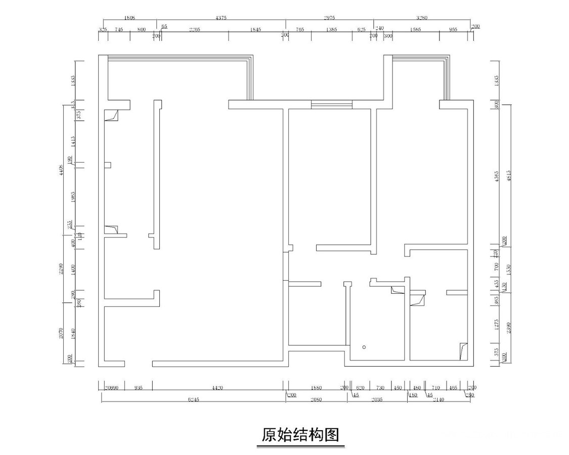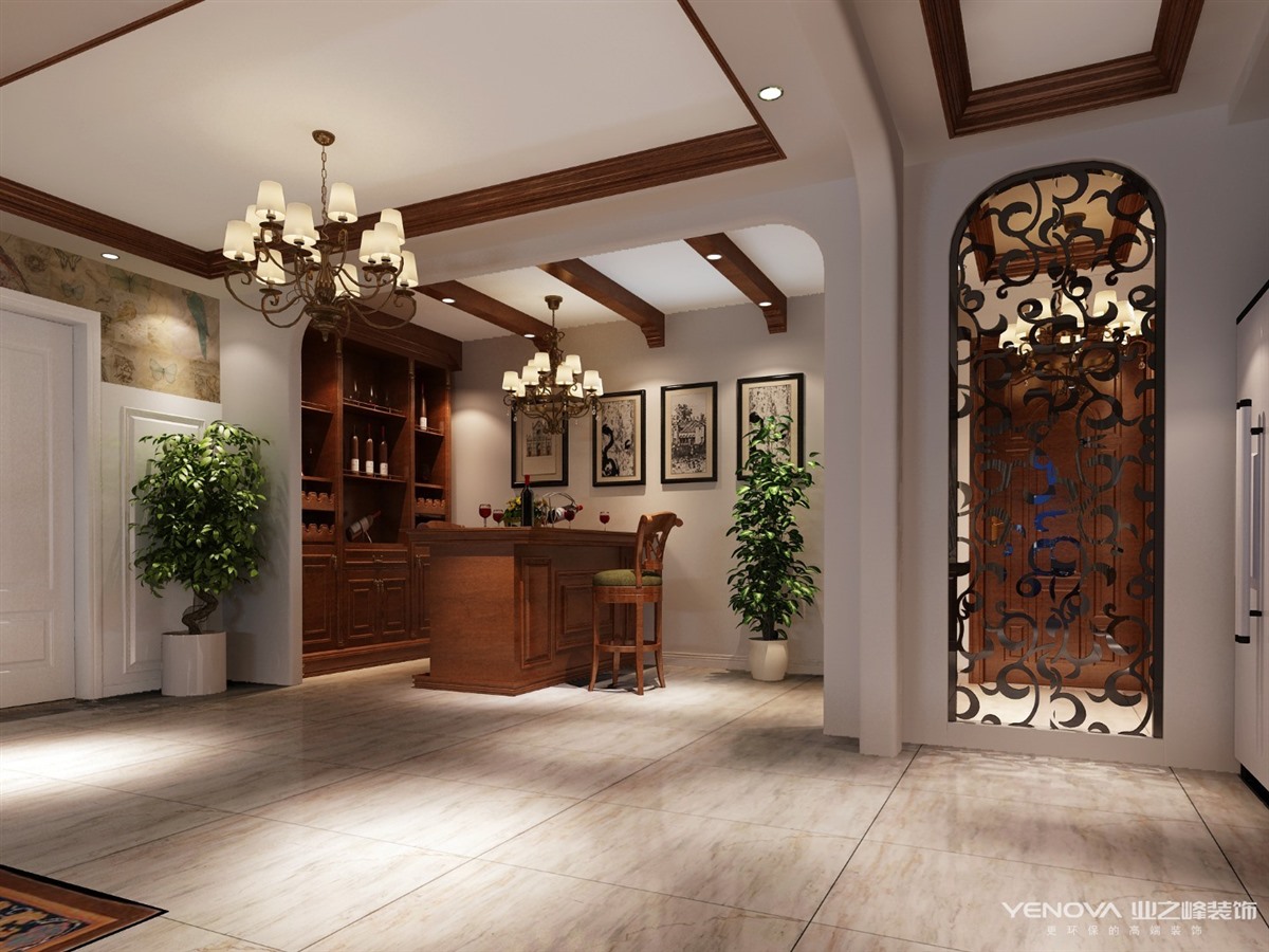 在沟通中了解到,这对夫妻喜欢宽敞的生活空间,且暂时不准备要小孩。所以为满足业主需求将原户型内大部分的轻体墙都拆除了,保留的轻体墙是为了使空间显得整齐协调,与轻体墙间不能拆除的柱子相搭配形成几个能分割空间的拱形垭口,更好的装饰点缀敞亮的客餐厅。入门处正对厨房,所以将拆除轻体墙后正对入户门的拱形垭口做了一个固定式的烤漆镂空隔断,起到视觉缓冲的作用,同时也美化空间,体现业主生活空间的质感。入门右侧设立了置顶的鞋帽柜,满足业主日常的生活需求。沿着室内的生活动线,先看到的是吧台休闲区,靠边的酒柜,位于休闲区的中央的吧台桌椅,与拱形垭口呼应的假梁吊顶造型,都是用胡桃木制成的,颜色和装饰效果上都协调统一,不显突兀。客餐厅和厨房也是如此。厨房顶面延续了吧台的造型设计,使设计元素不单调,并相呼应。墙面选用米黄色的砖,暖色装饰不会影响业主的食欲。客厅用仿古壁纸和喷漆的木质造型板、木质顶角线作为主要造型元素,使空间显得大气、高雅。户型图