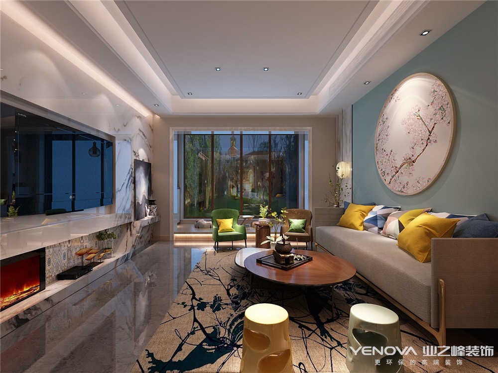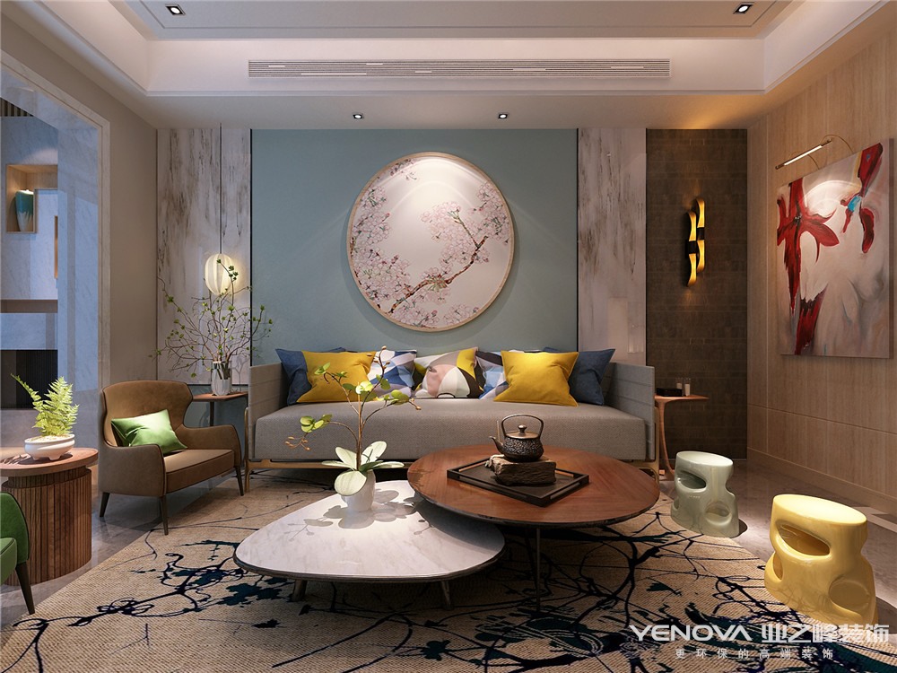 本案采用了素雅大气的新东方设计风格。大抵以大地色系为主,与灰色系结合,营造一种缥缈而不是温馨质感的独特空间。大理石电视背景墙则是整个空间的独特之处,用简单的方式凸显东方的雅致与灵动之美。以新东方风格演绎如此畅达的空间,即将中式经典元素加以提炼,并与现代风格及材质兼容并蓄,既体现出对东方精神的追求,又为家居文化注入新的时尚气息。