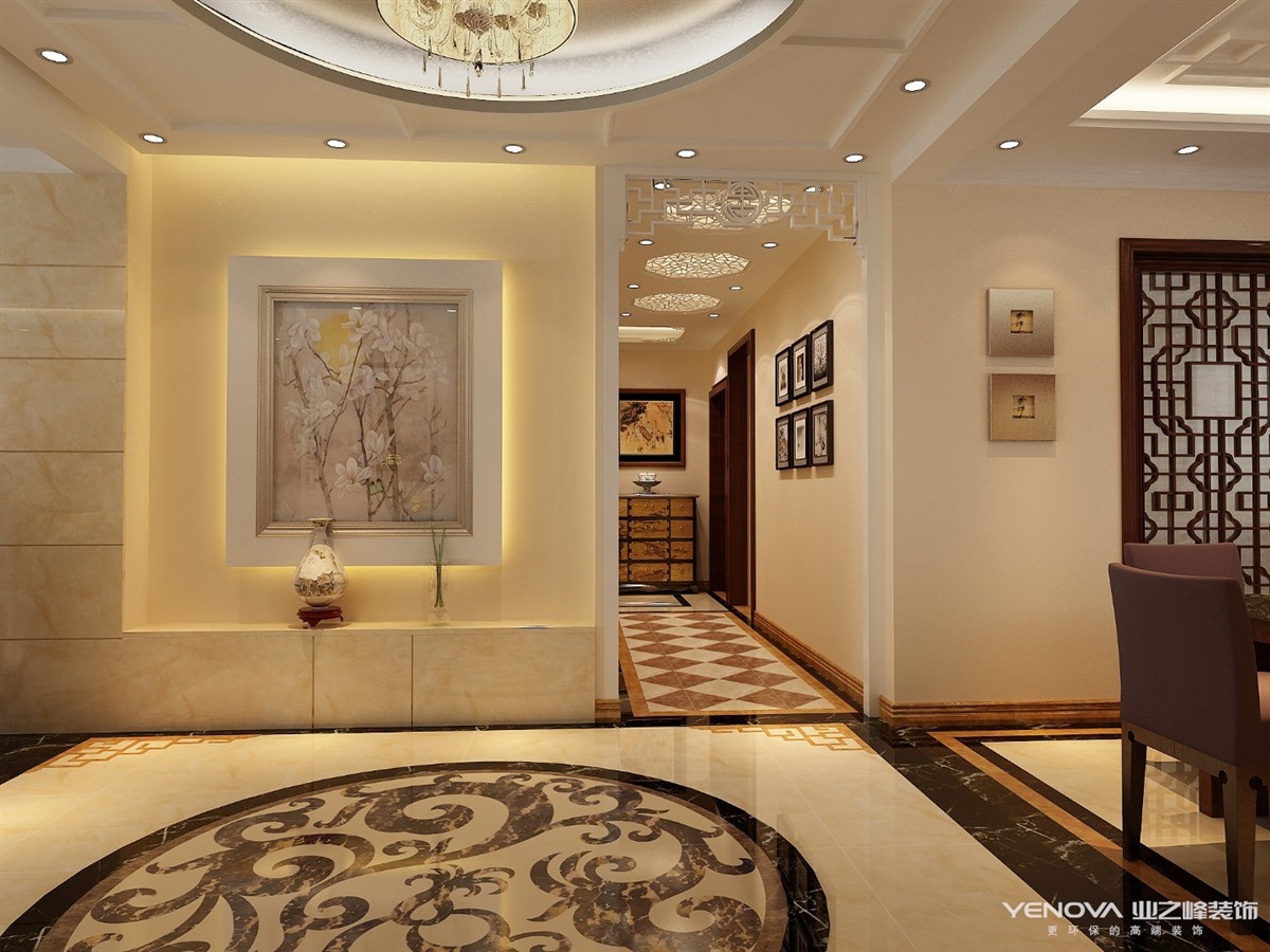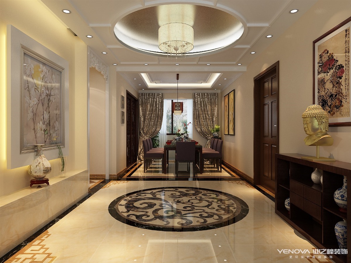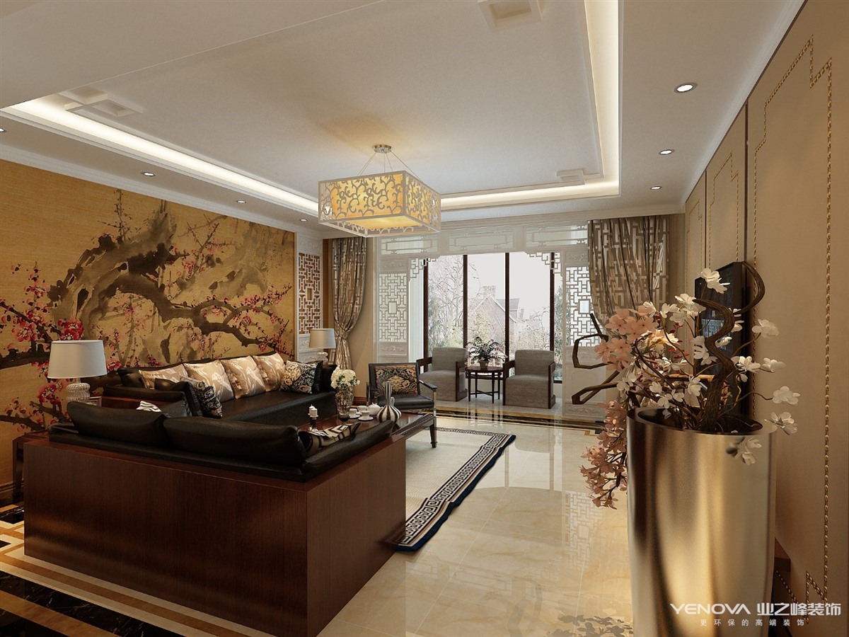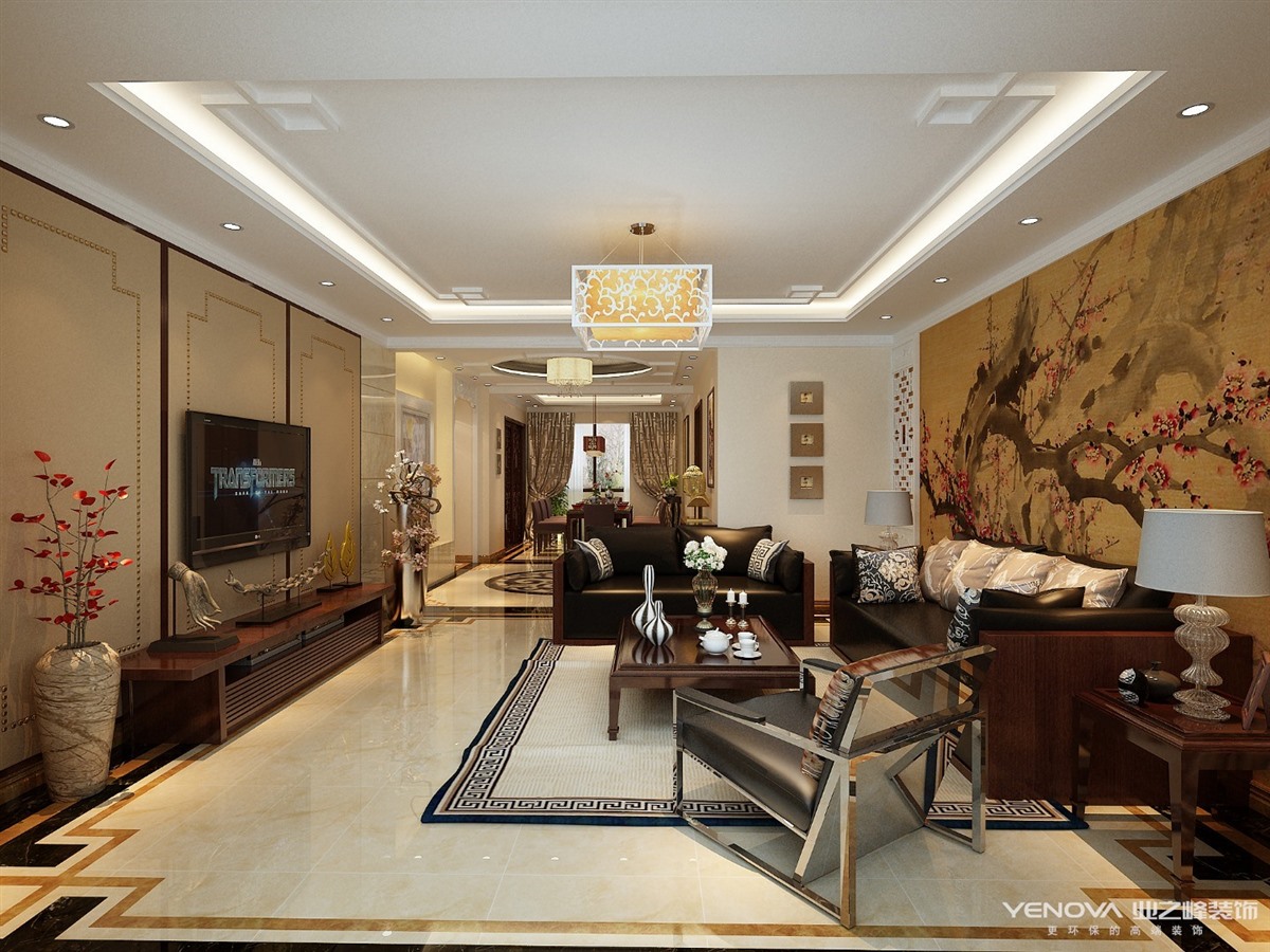 由于客厅整体空间不通透,两侧均是墙体,客厅带有阳台,采光非常好、全是承重墙,格局上做不了较大变动,为弱化狭窄通道,特意用新中式风格和漆反光灯池造型做对称墙体造型,新颖别致,效果华美。吊顶区域宽阔,为使得主辅光源分配均匀且与家具相呼应,做两部分相关联吊顶,使得区域及通道空间划分明确.客厅及过道地面以地砖为主,简单大气!吊顶反光灯池灯吊顶和地砖、波打线、漆得结合,以艺术的手段加以融合,增加空间的通透性。