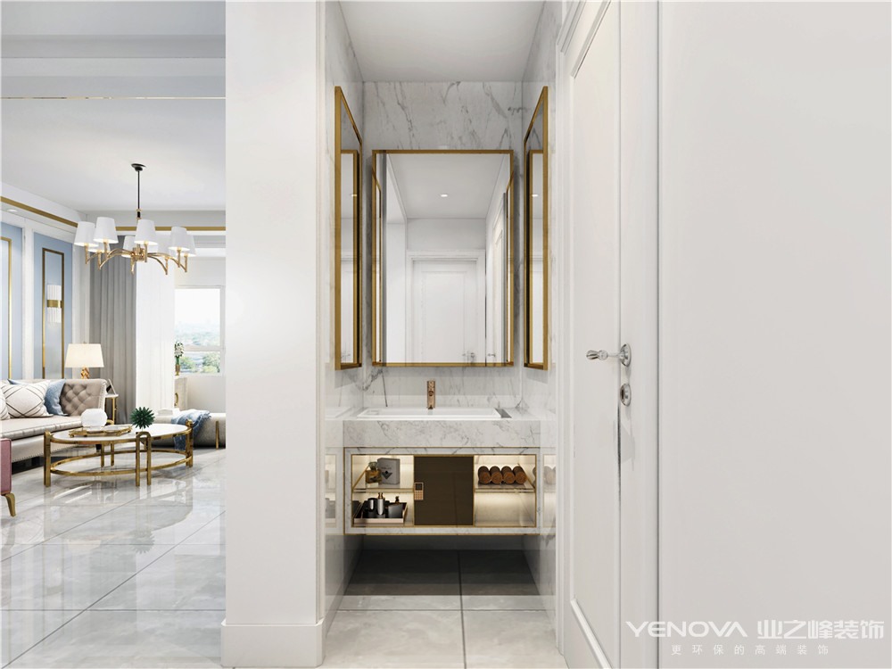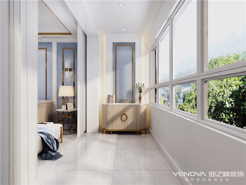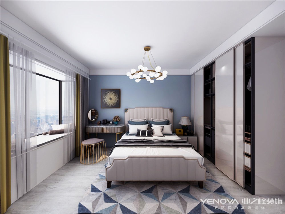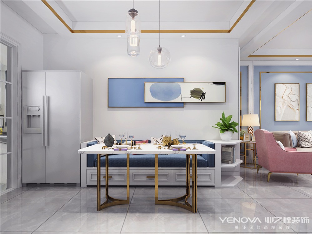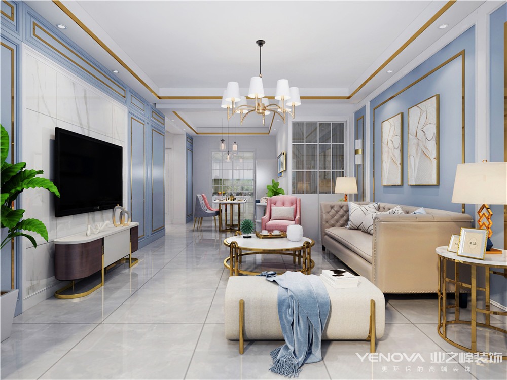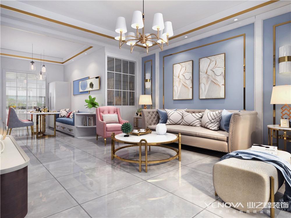 本案的主题为轻奢风格,简约俐落的质材铺叙与敞明大方的格局尺度,是轻奢风定调的设计居宅中,不可或缺的重要元素。在案例中,蓝为主色调配合简欧式家具,墙面、地面、家具陈设等均以简洁的造型、金属线条的装饰精细的工艺为其特征,强调品质感和细节处理。