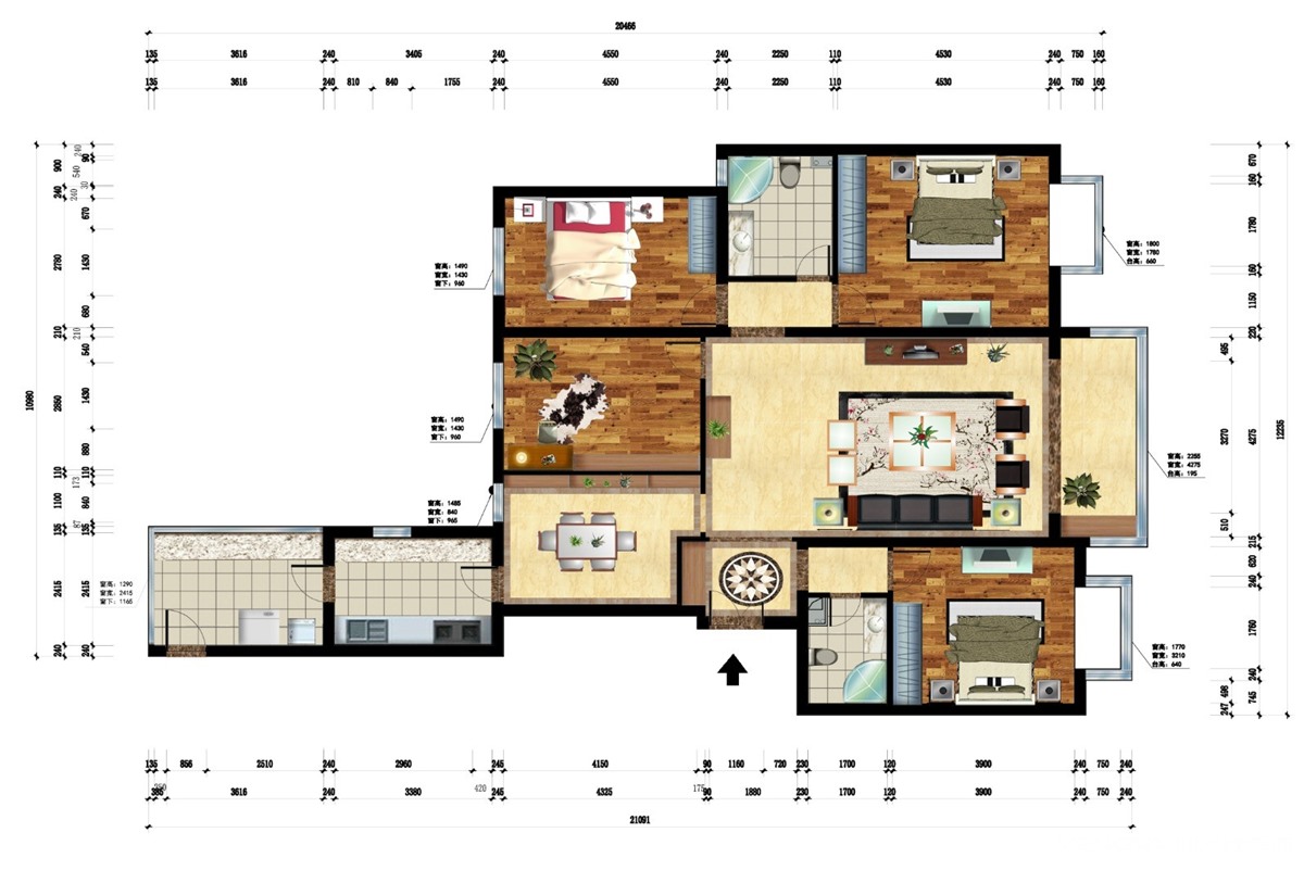 通过对户型的现场勘测和考察,对该户型大致了解之后,觉得该户型基本上没有什么不足之处,不需要大的改动。因此通过设计对该户型设计主要放在了功能分区和室内的装饰细节上,使装饰风格与功能分区统一结合,既不影响每个空间的合理运用,也不影响家庭的日常起居。