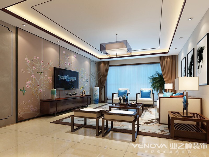【客厅】客厅在装饰风格上一暖色调为主,新中式简约家具,整个空间装饰方面以白色墙面为主配有中国古典特色的水墨背景墙,还有新中式的现代装饰画,家具为简约新中式家具,配上吊顶的暖光的灯槽,整个客厅的风格更加雅致。