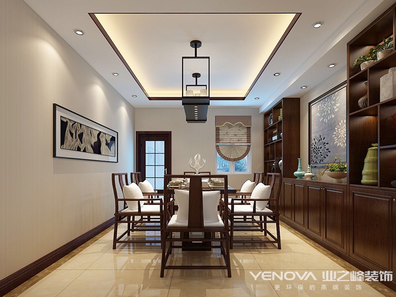 【餐厅】餐厅地面铺贴地砖贴木制踢脚线,顶面石膏板灯池吊顶,四个边贴一圈木条。餐桌旁边放一个餐边柜和两组装饰柜,餐厅的家具和空间的色调相搭很有中式韵味。